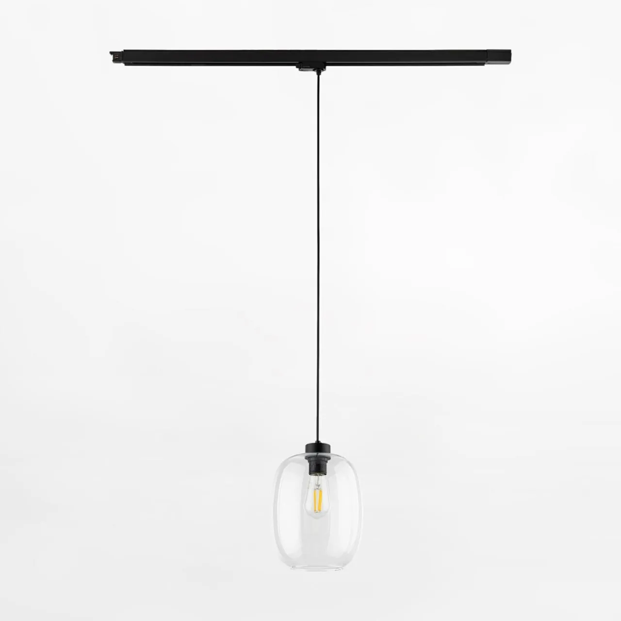 - Górna część oprawy i mocowanie do szyny są w czarnym, matowym kolorze. Dolna posiada transparentny, lekko dekorowany klosz, który mieści 1 żarówkę typu E27.