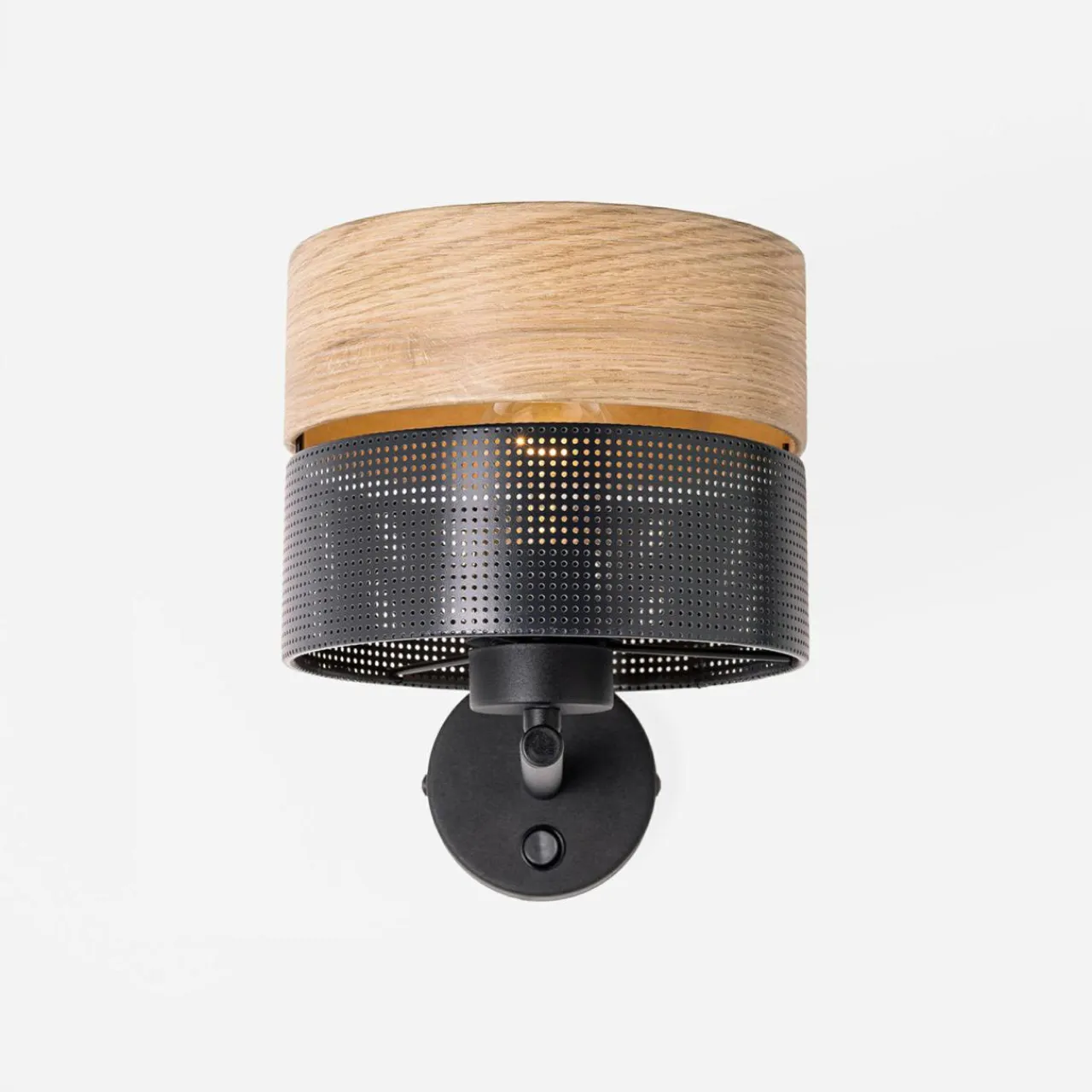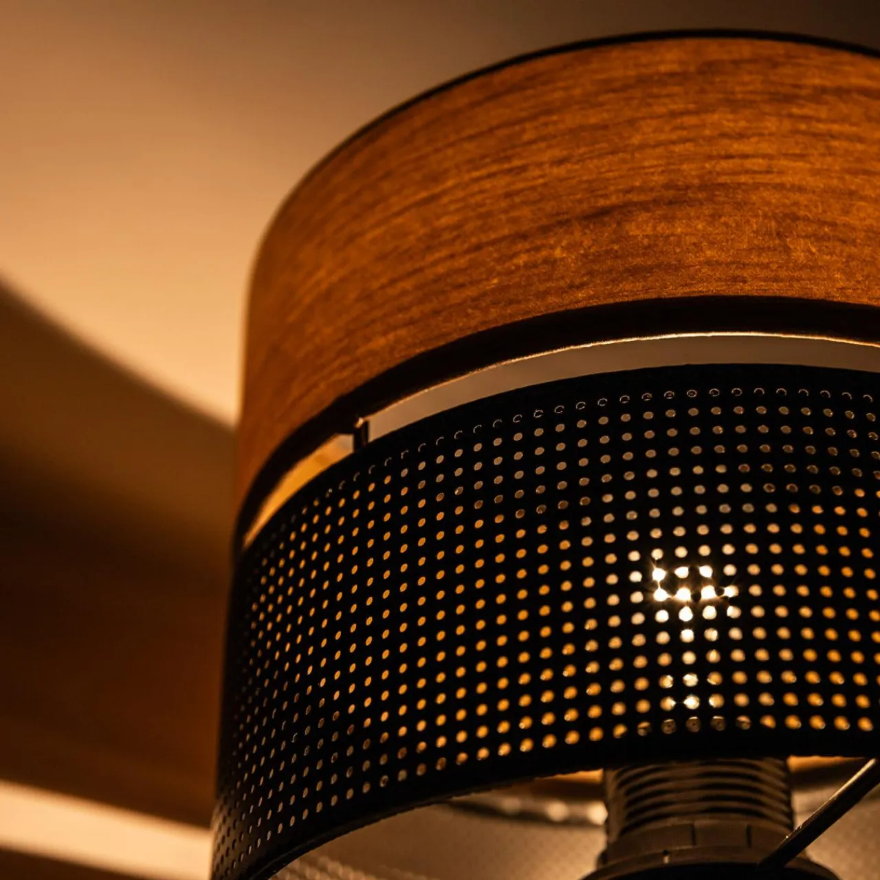 Specjalnie dobrany do lampy abażur składa się z 2 części. Górna jest jasna w kolorze naturalnego drewna natomiast dolna – czarna i matowa.