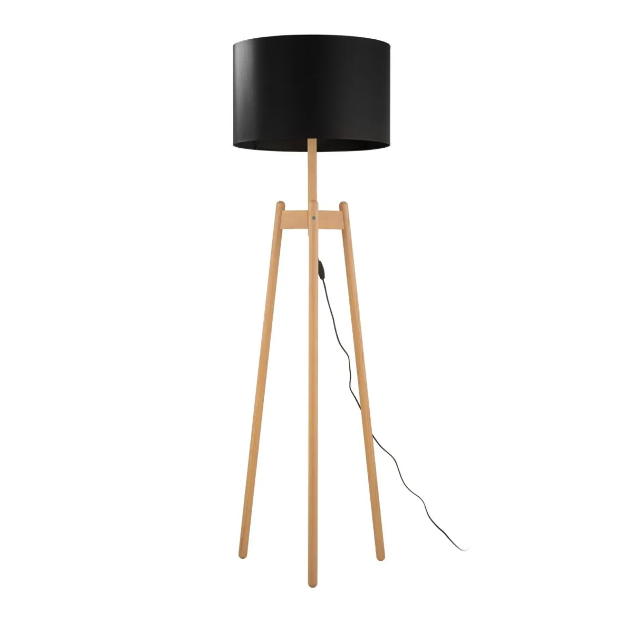 - Trójnóg w kolorze jasnego drewna dopełnia czarny abażur wieńczący lampę. Całość świetnie podkreśla naturalne elementy otoczenia.