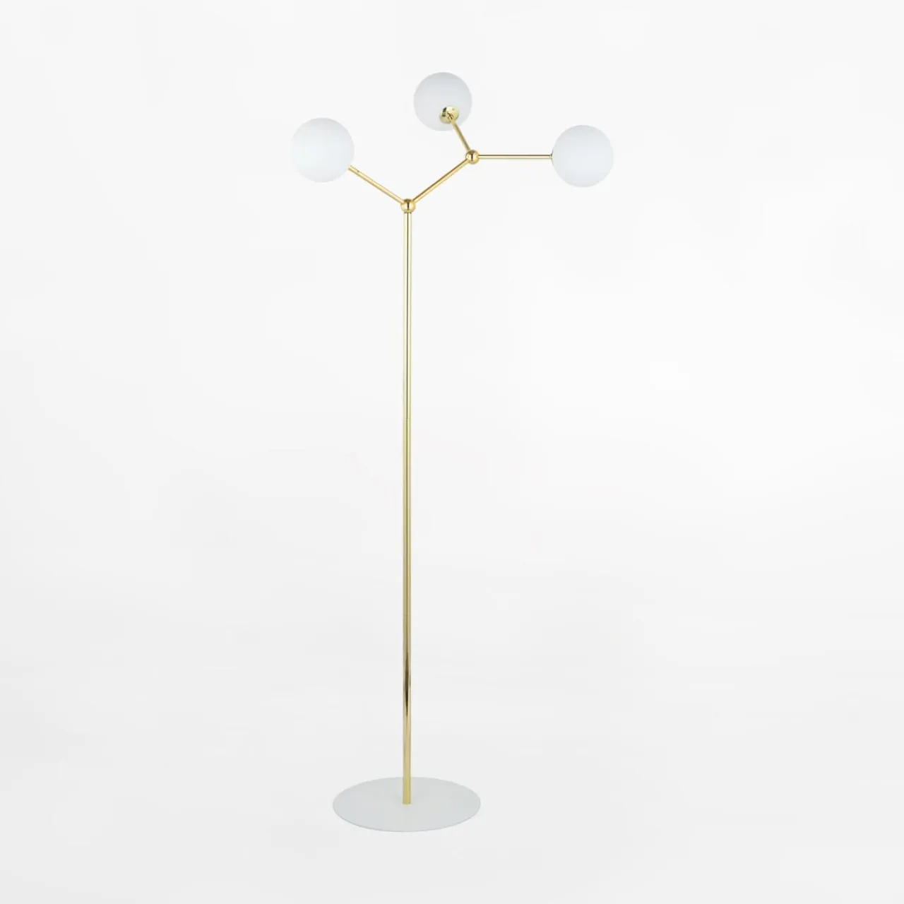 - Prosty stelaż w złotym kolorze oraz 3 białe, kuliste klosze rozjaśnią i ocieplą wizualnie wnętrze.