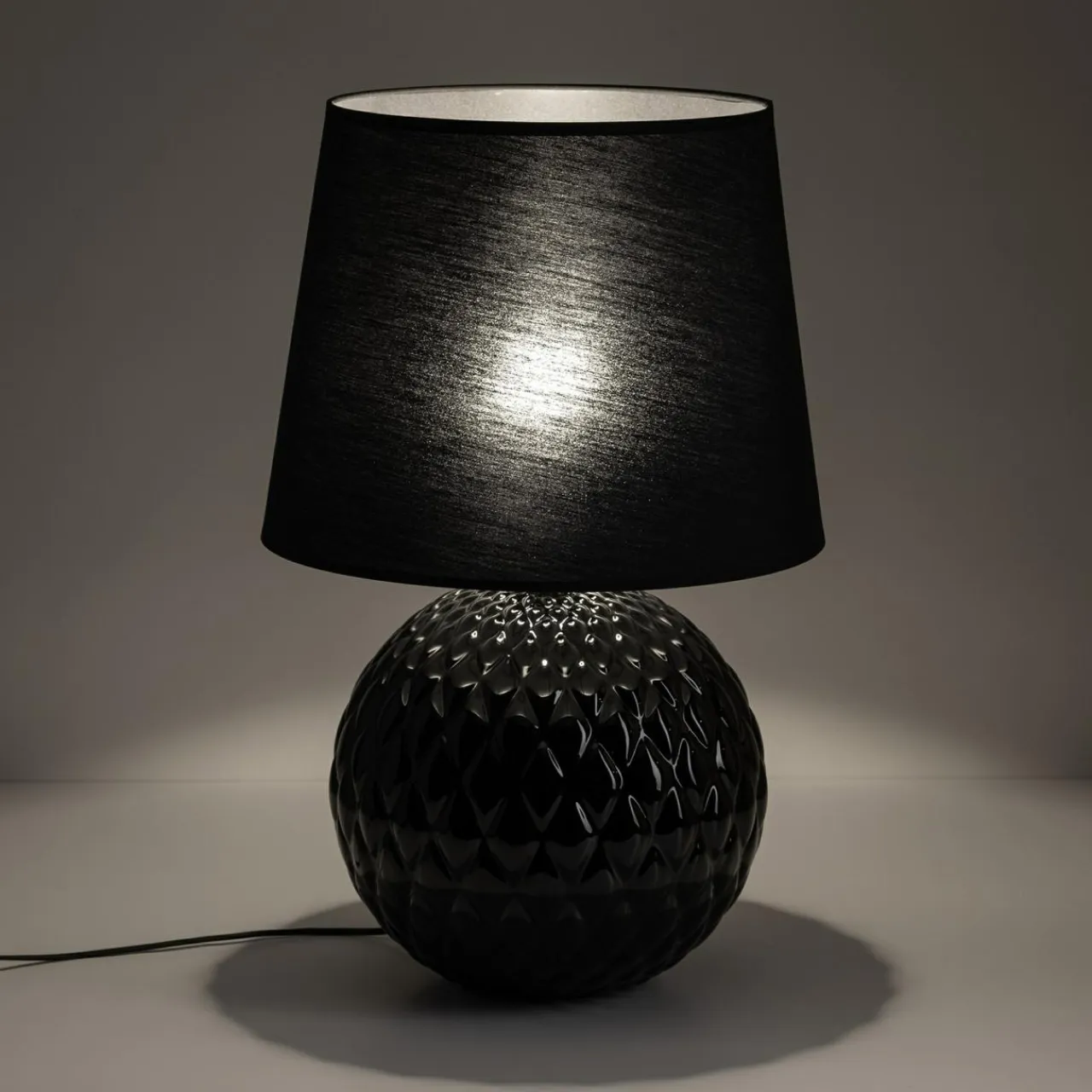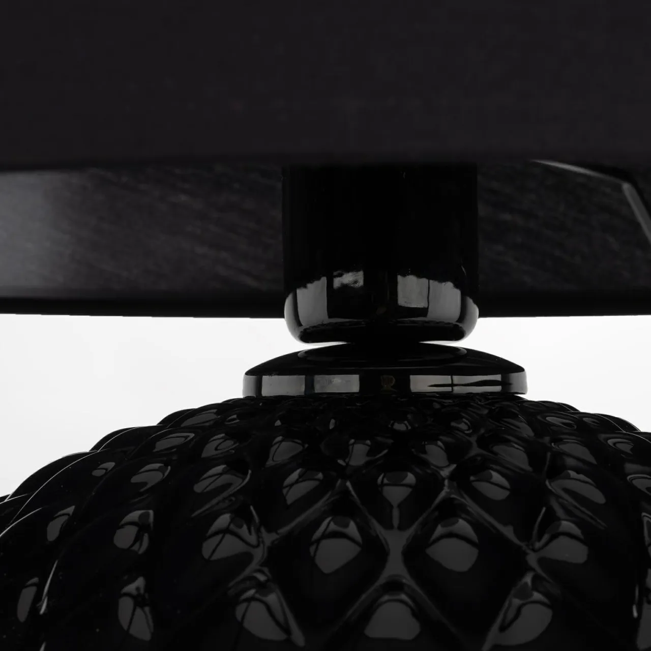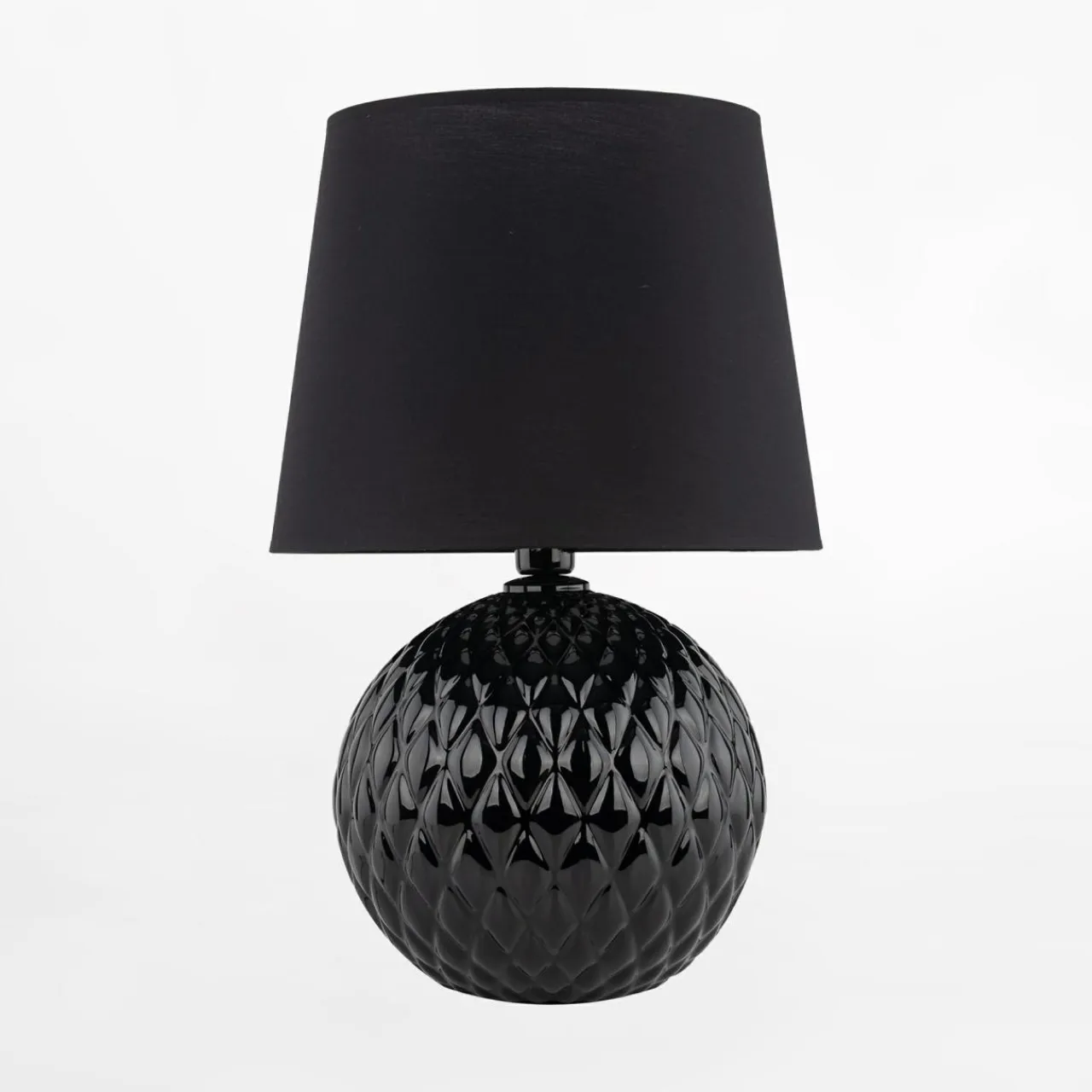 Podstawa lampy SANTANA jest kulista, ze wzorem w romby. Wykonana została ze szkła z czarnym, lakierowanym wykończeniem przy oprawie żarówki.