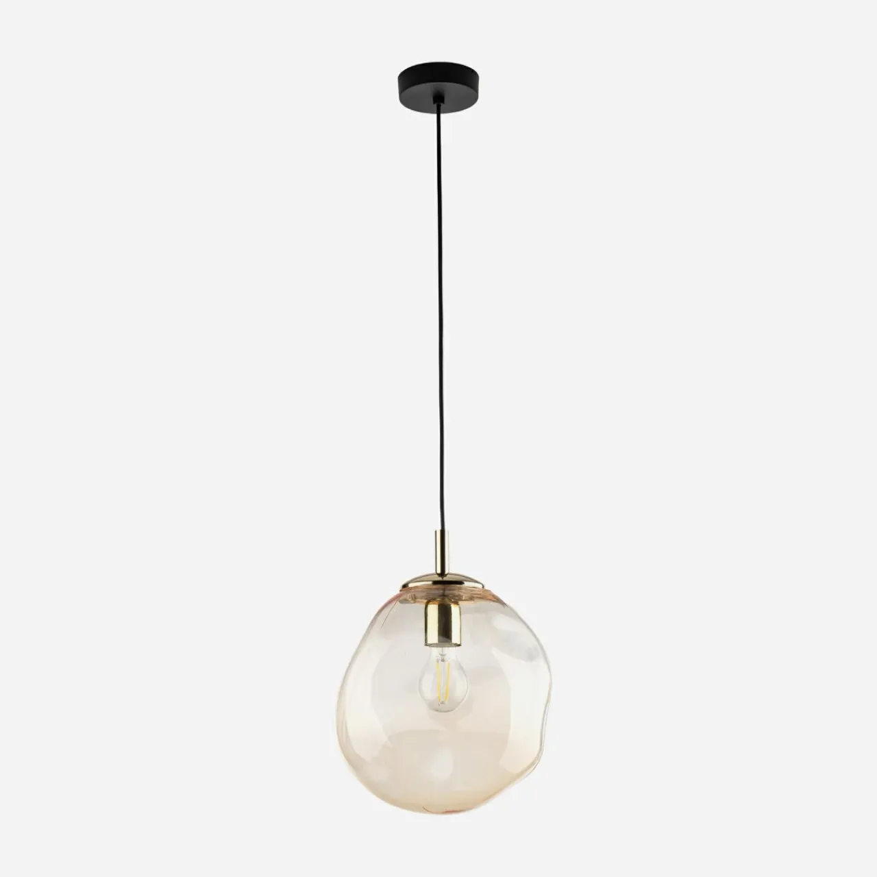 Zwraca uwagę oryginalnym kształtem klosza, bursztynowym kolorem klosza i złotym wykończeniem.