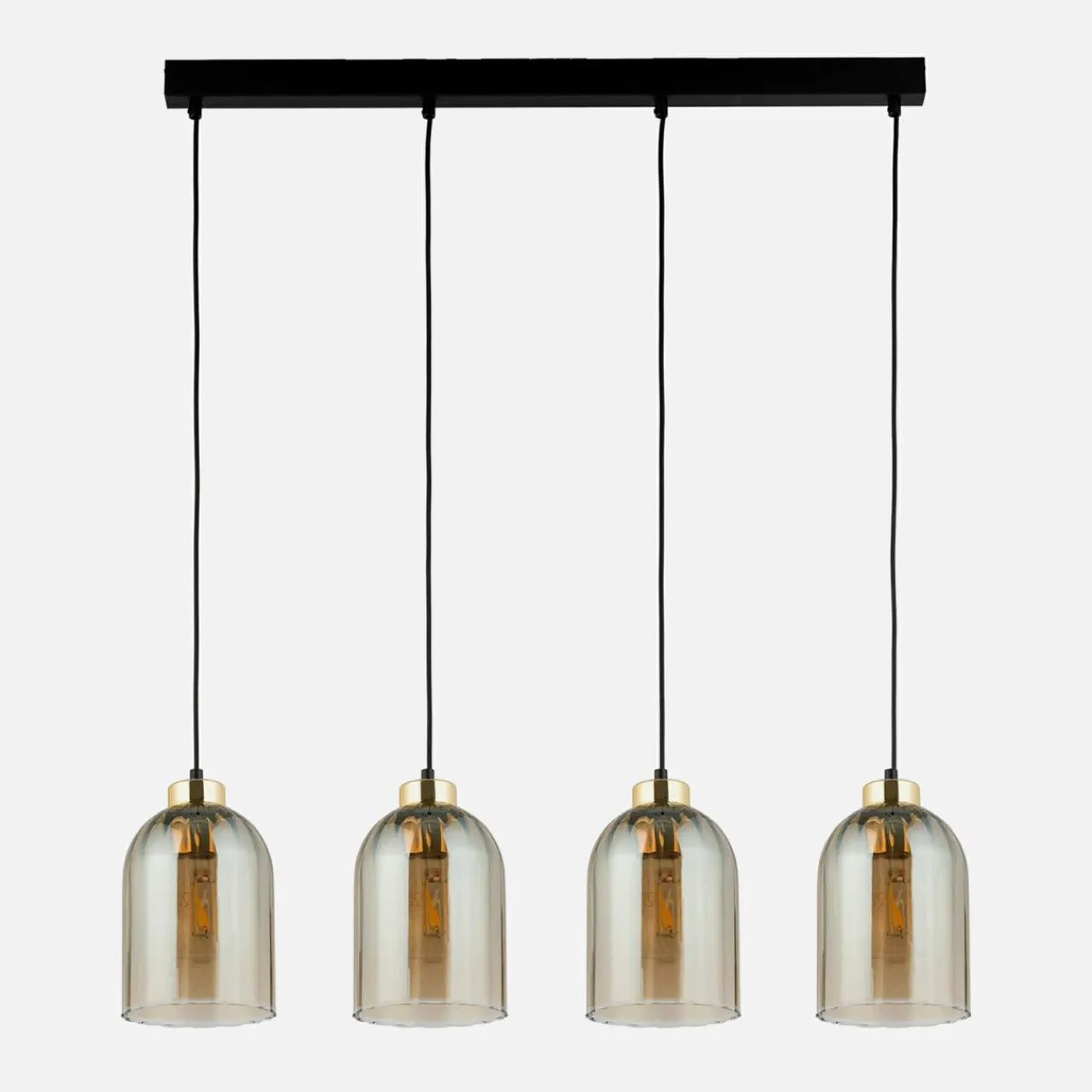 Ten model z podstawą o kształcie listwy i 4 szeregowo zawieszonymi kloszami w bursztynowym kolorze świetnie odnajdzie się w reprezentacyjnej części mieszkania.