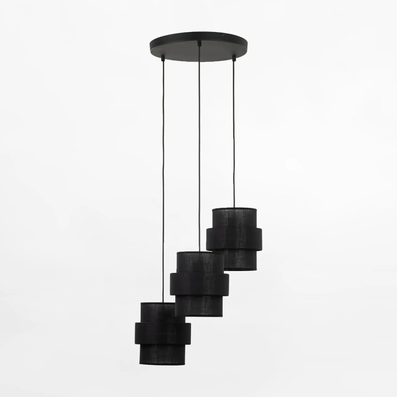 - Każdy z 3 abażurów lampy to połączenie 2 obręczy z umieszczonym w centrum konstrukcji źródłem światła.