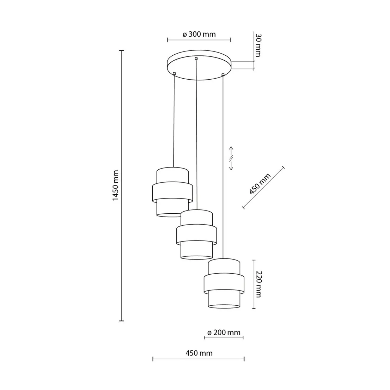 W tym modelu lampy wiszącej możesz dopasować wysokość zawieszenia. Maksymalna wysokość lampy wynosi 145 cm.