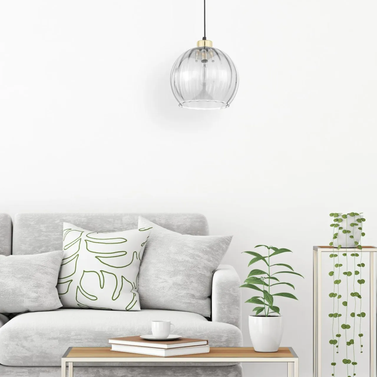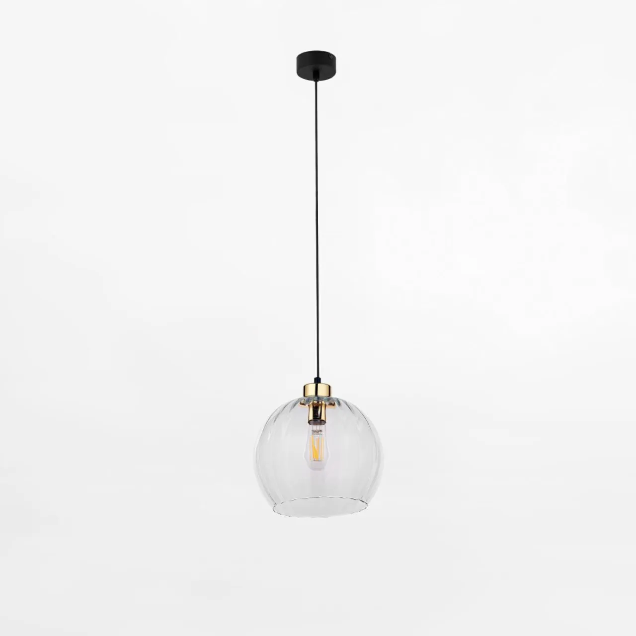 - Szkło klosza lampy DEVI jest transparentne, z lekkim wzorem, pozwala dostrzec kształt żarówki, która znajduje się w jego wnętrzu.