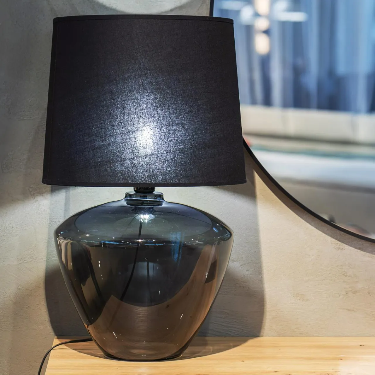 - Abażur ma klasyczny kształt trapezu, opinająca go tkanina jest czarna.