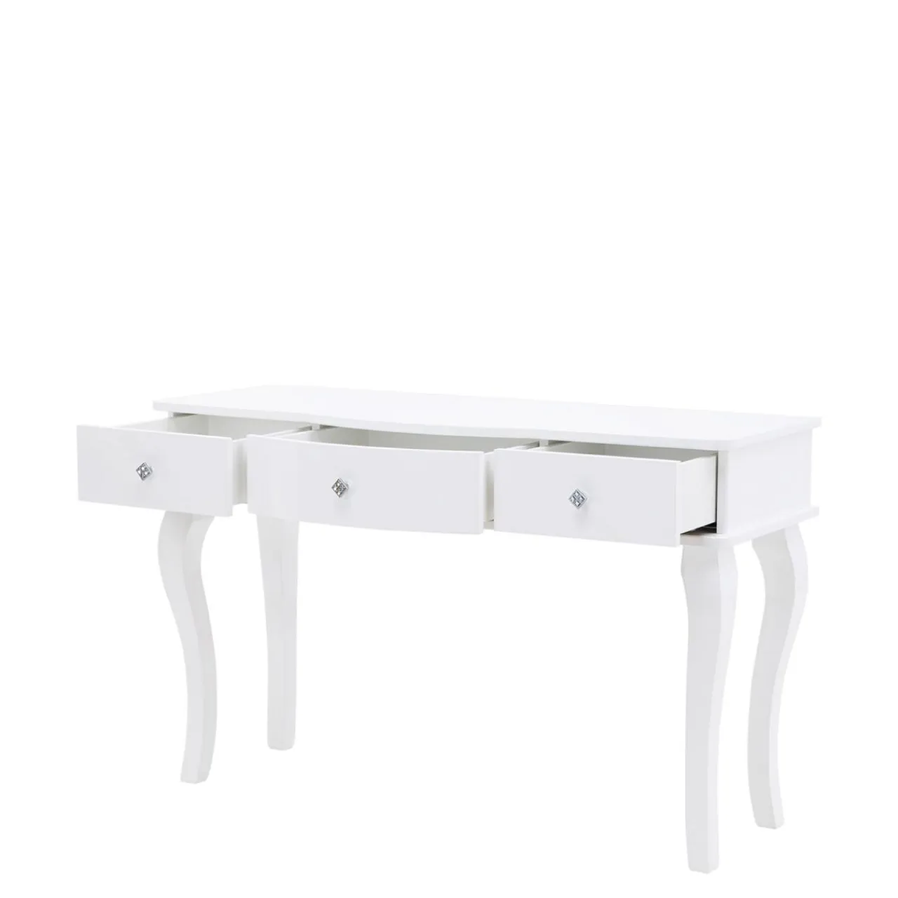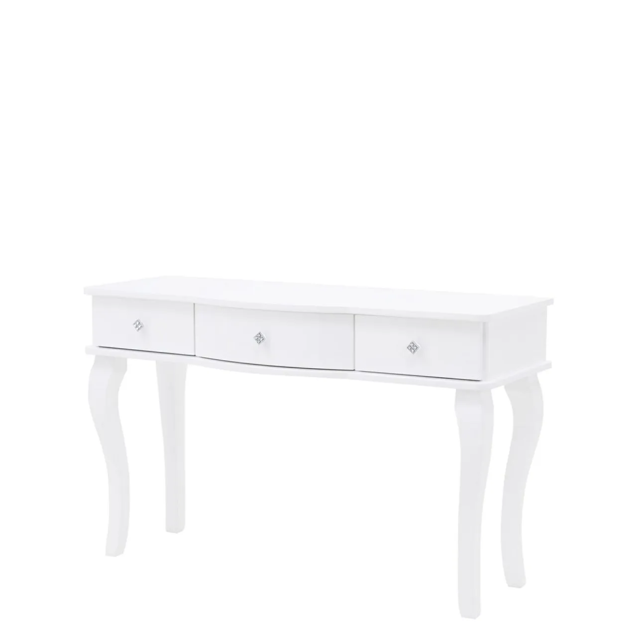 Toaletka została wykończona białym lakierem w wysokim połysku, ozdobne nóżki są wykonane z litego drewna, uchwyt jest zdobiony kryształkami.