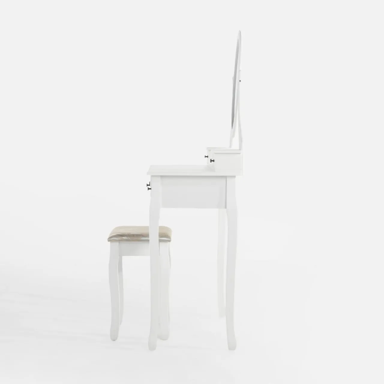 Stylowe zdobienia mebla przywołują na myśl klasyczne, bogate wnętrza. Toaletka z siedziskiem i lustrem jest od razu gotowa do użytku.