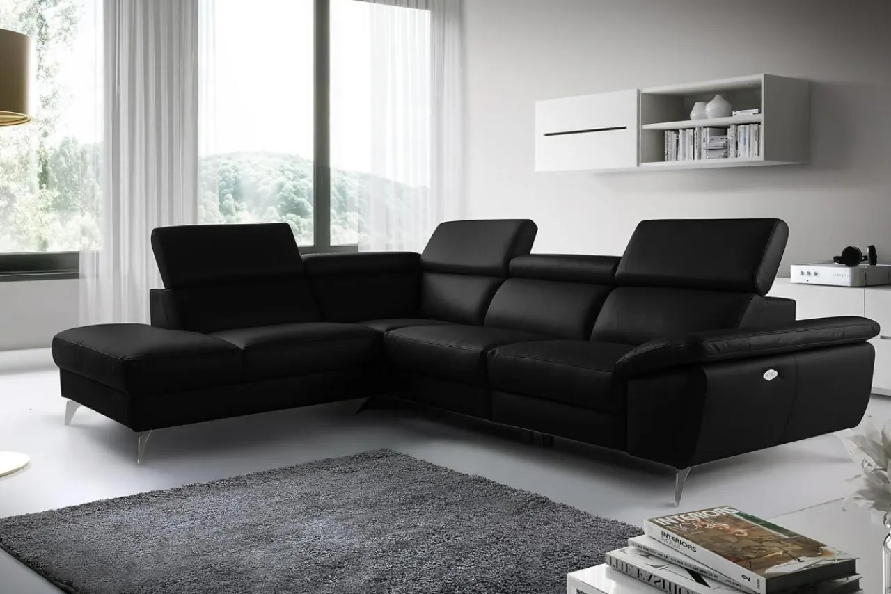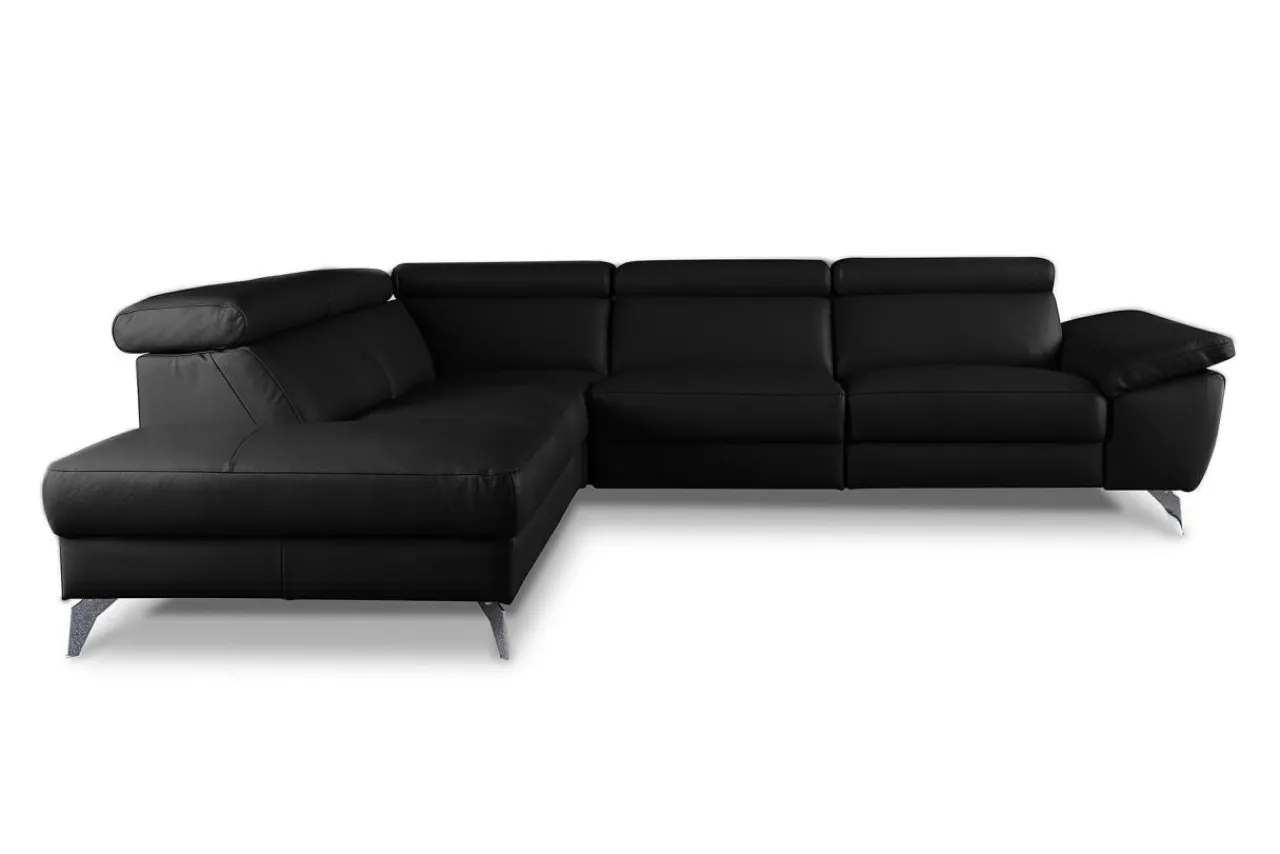 Narożnik została pokryty skórą naturalną z kolekcji DOLLARO w odcieniu NERO. Metalowe nóżki podkreślają nowoczesny charakter narożnika i nadają mu nieco smukłości.