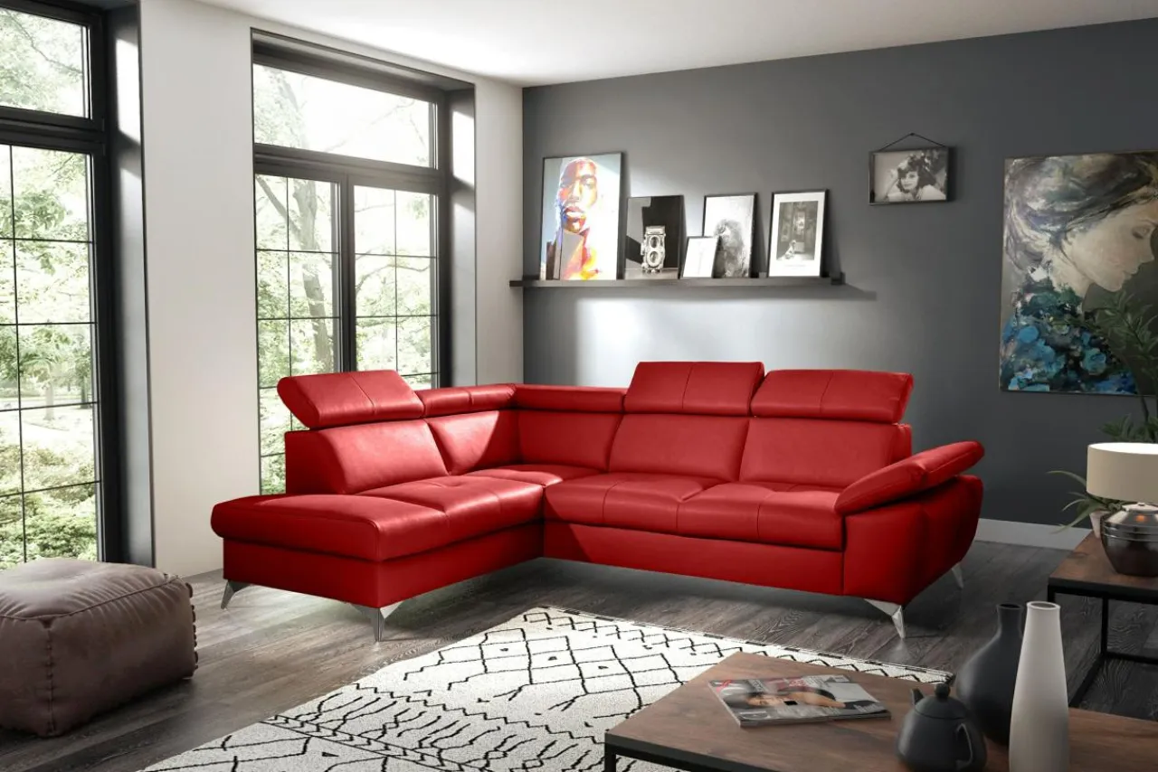 - Wykończone skórą naturalną plecy narożnika umożliwiają ustawienie go w centralnej części pomieszczenia.