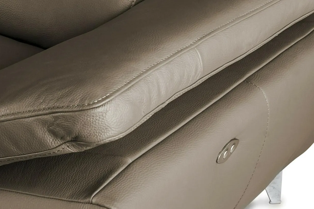 Tapicerka ze skóry naturalnej w szarobeżowym odcieniu oraz smukłe, metalowe nóżki sprawiają, że mebel wpisuje się w aktualne, designerskie trendy.