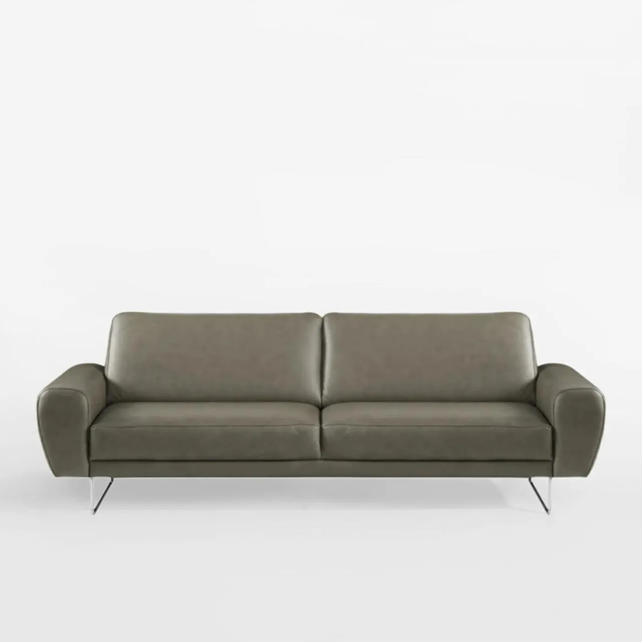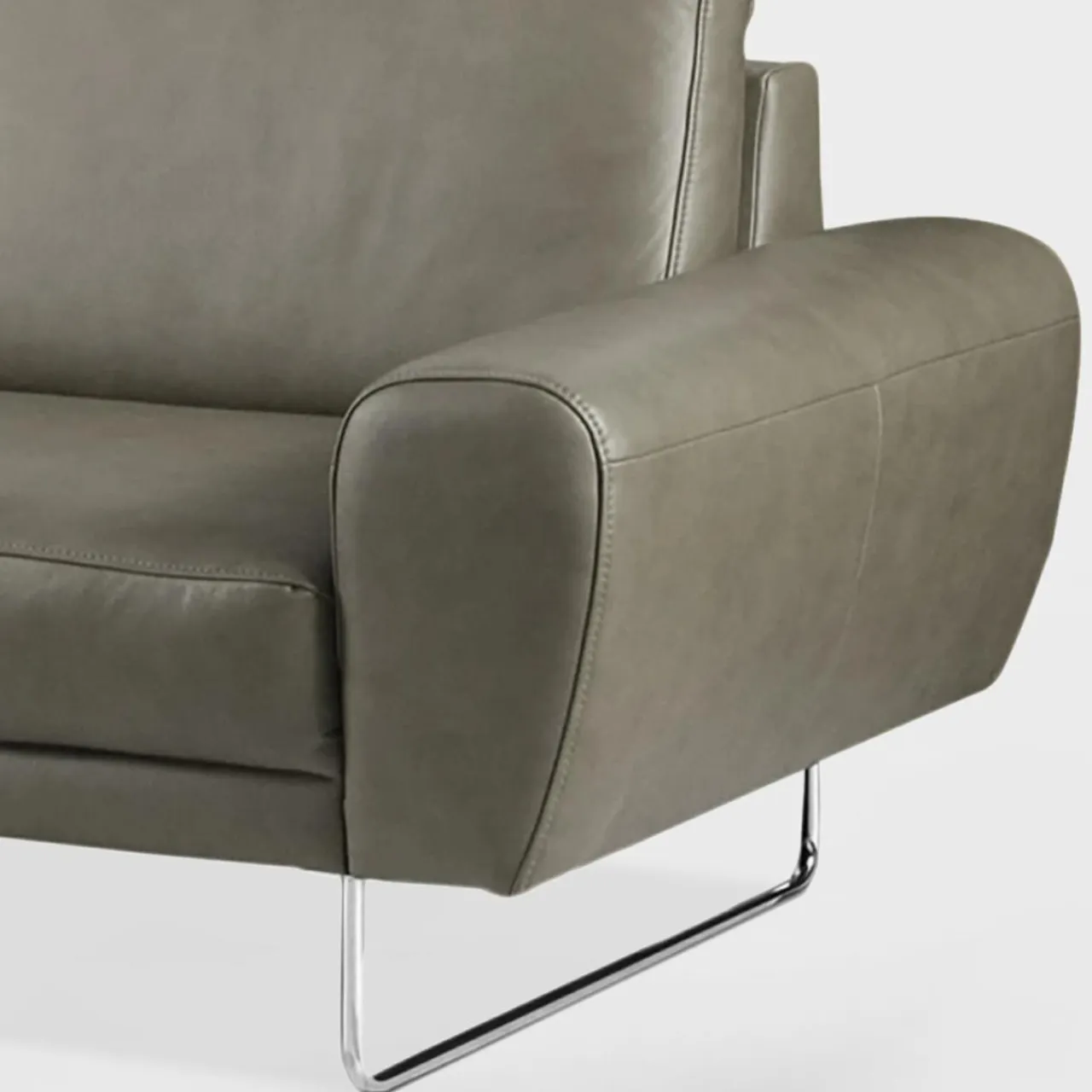 Sofa SPRING została wykończona skórą naturalną NATUR o szarym wybarwieniu. Jest ona przyjemna w dotyku, łatwa w utrzymaniu czystości, a odpowiednio zadbana zapewnia trwałość na wiele lat. Metalowe nóżki mebla to charakterystyczne płozy nadające sofie modernistycznego wyglądu.