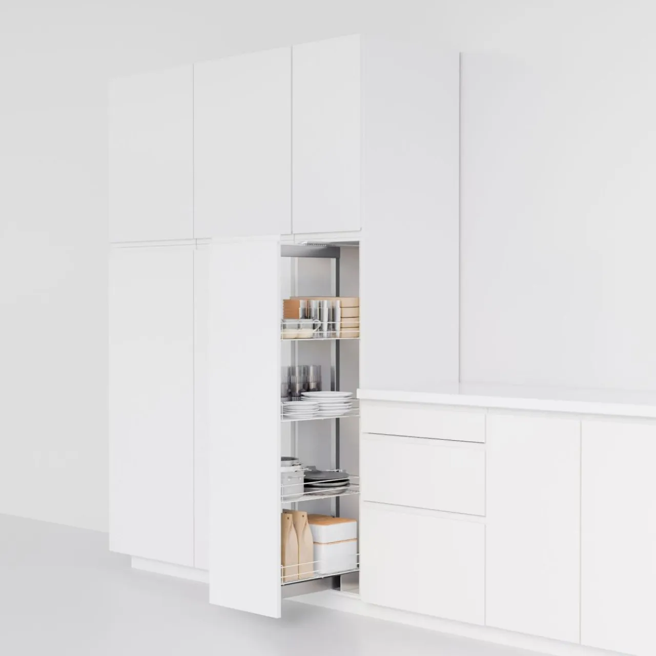 Wysuwane, pionowe szuflady, ruchome koszyki, czy półki montowane w szafkach narożnych pozwalają w intuicyjny sposób wykorzystać przestrzeń w kuchni i skutecznie nią zarządzać.