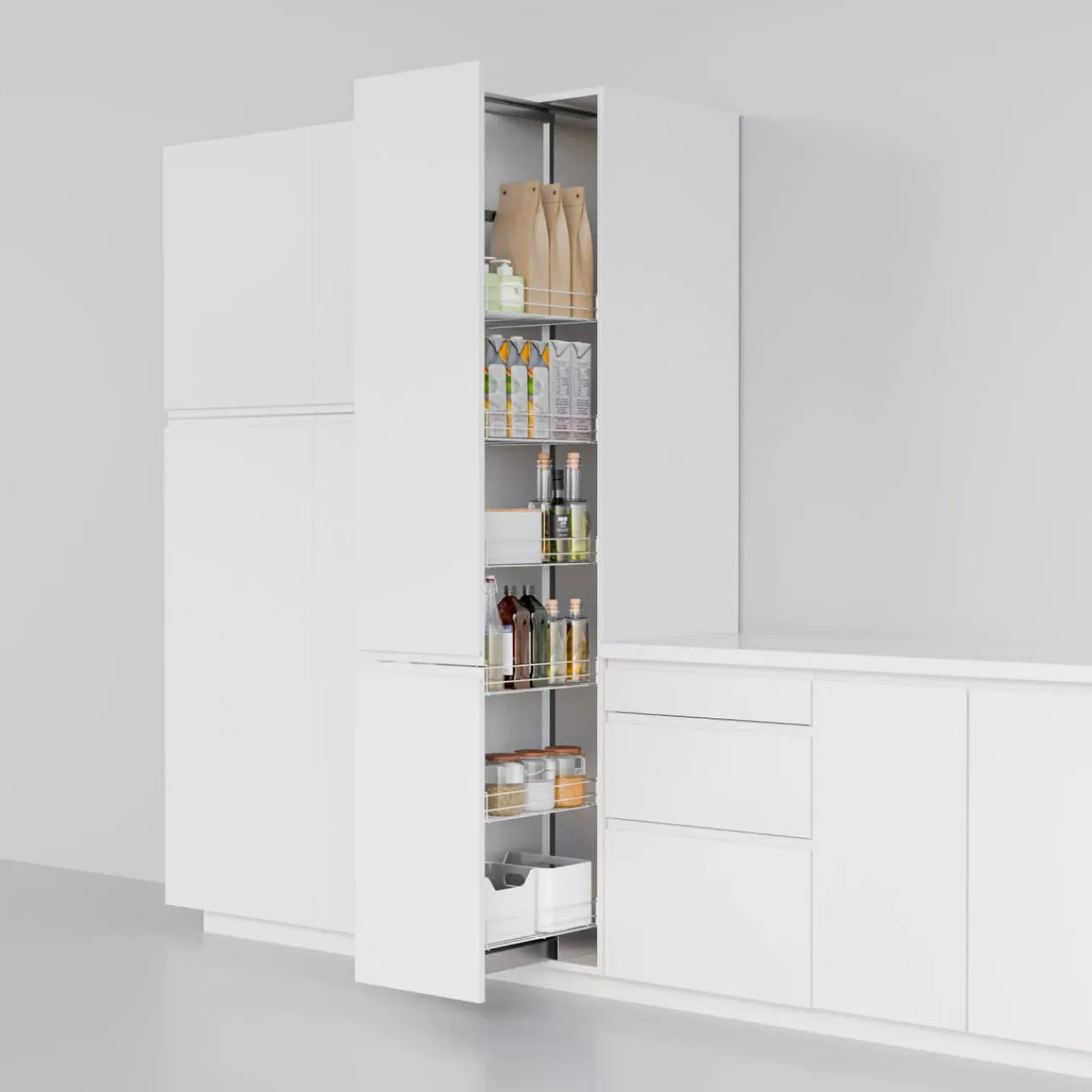 Wysuwane, pionowe szuflady, ruchome koszyki, czy półki montowane w szafkach narożnych pozwalają w intuicyjny sposób wykorzystać przestrzeń w kuchni i skutecznie nią zarządzać.
