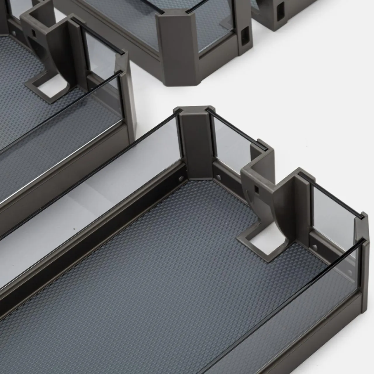 - Podstawa koszy została wykończona ciemnoszarym kolorem, natomiast brzegi i ścianki są z hartowanego szkła – razem dają połączenie, które dopasujesz do wnętrza nowoczesnej kuchni.