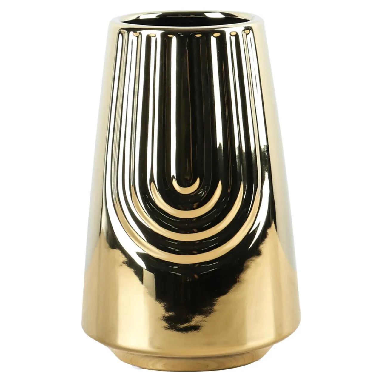 Wazon z tłoczeniem w modnym złotym kolorze to piękny i stylowy element dekoracyjny, który doda szlachetności i uroku Twojemu wnętrzu.
