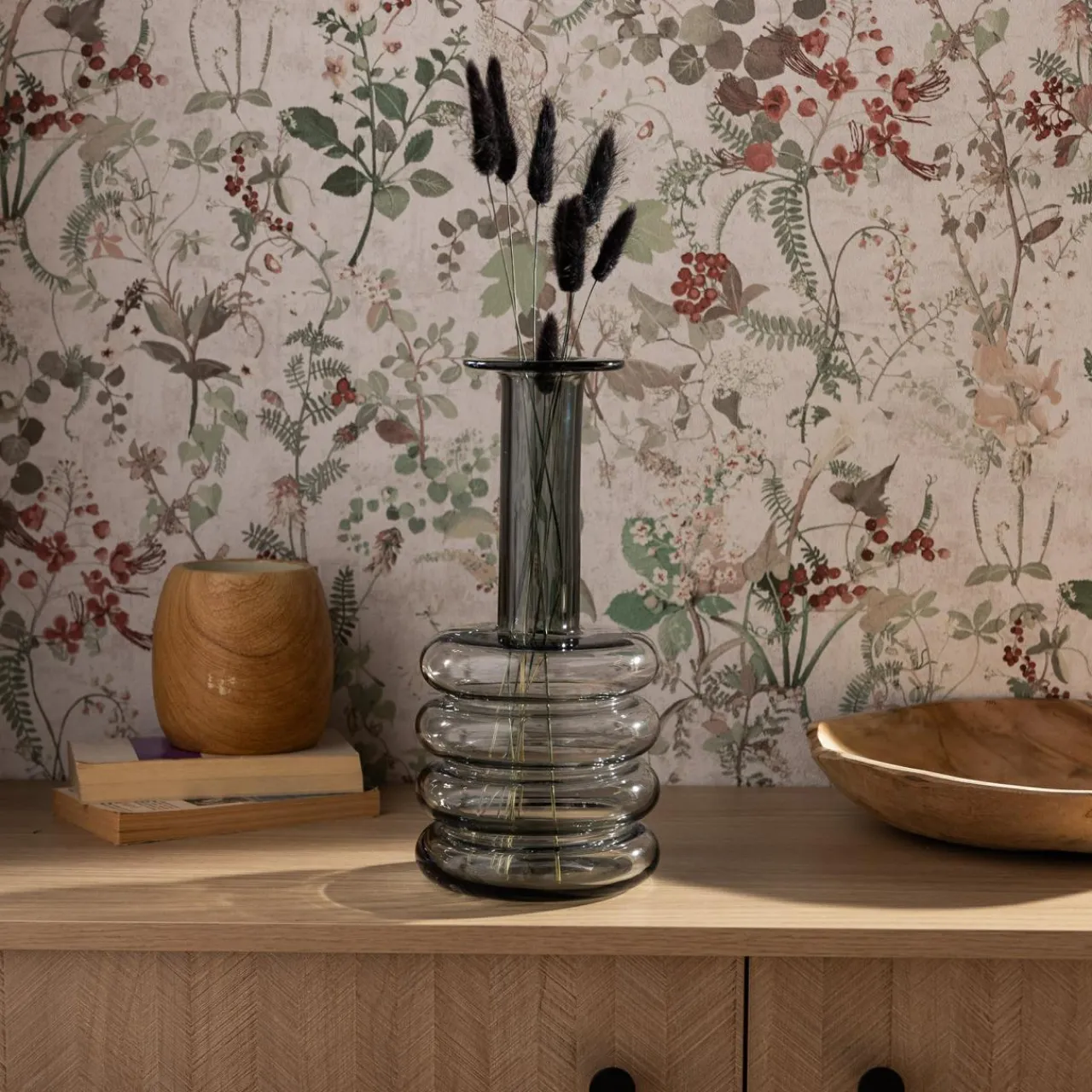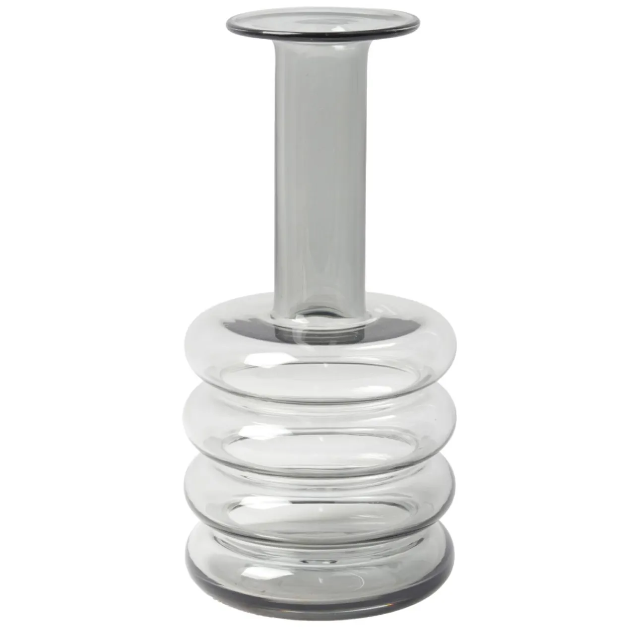 Wyeksponuj duży sztuczny lub naturalny kwiat w tym szklanym wazonie. Wazon ma minimalistyczny „poduszkowy” kształt zwieńczony wąską szyjką. Szare przejrzyste szkło sprawia, że wazon będzie pasował do wielu nowoczesnych wnętrz.
