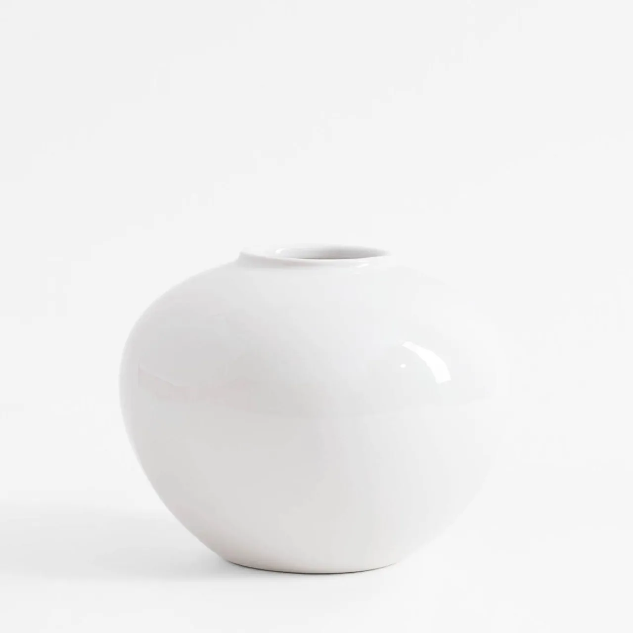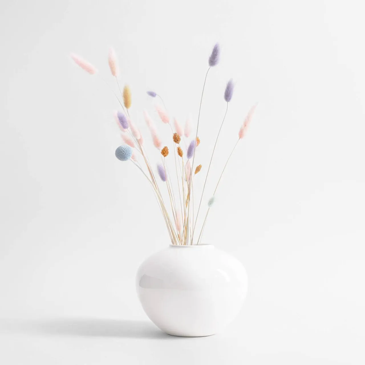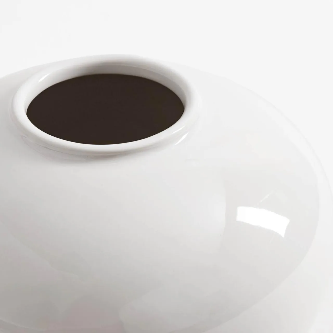 Biały wazon wyróżnia się szeroką i krągłą budową. Włożysz do niego cały bukiet ulubionych kwiatów lub pozostawisz dekoracją.