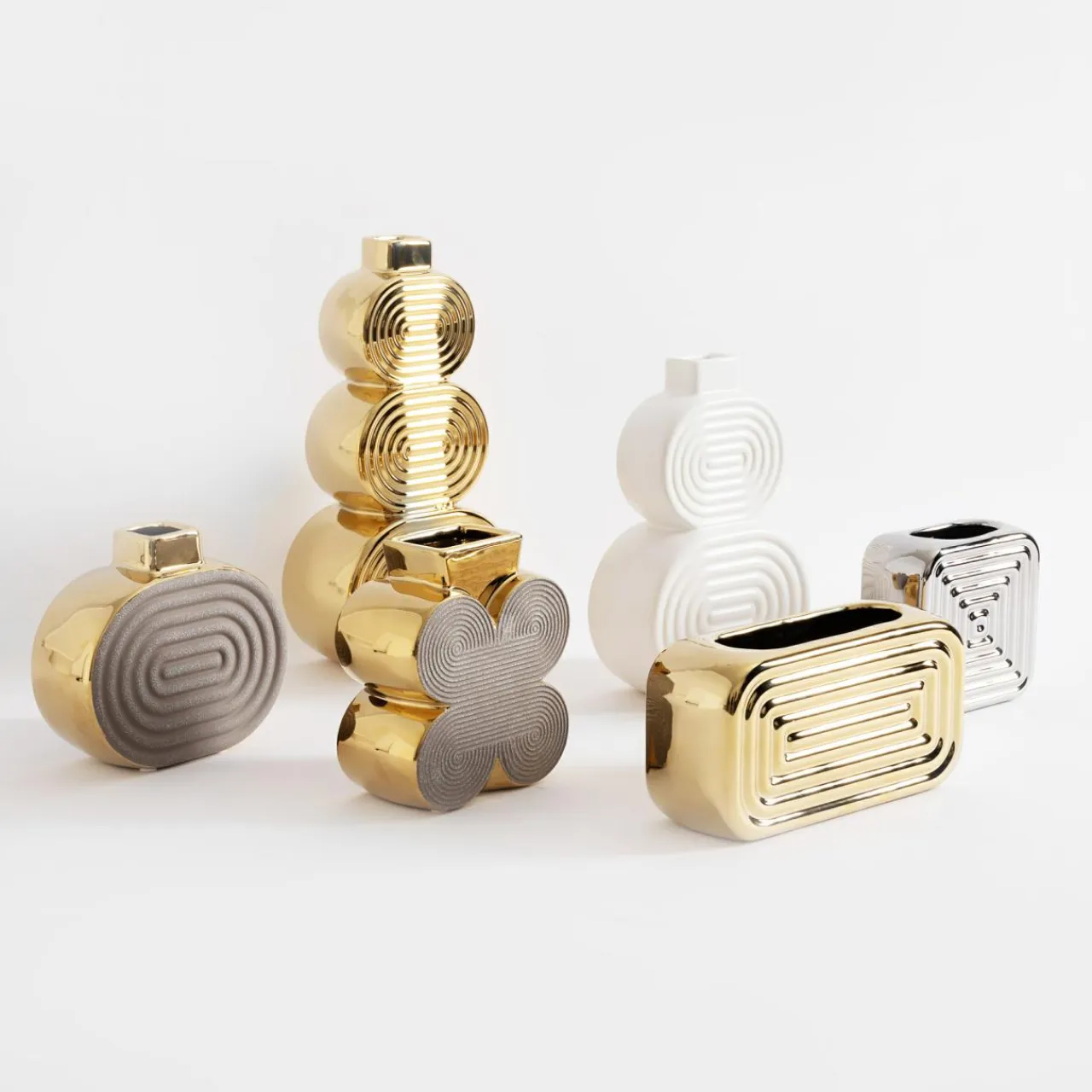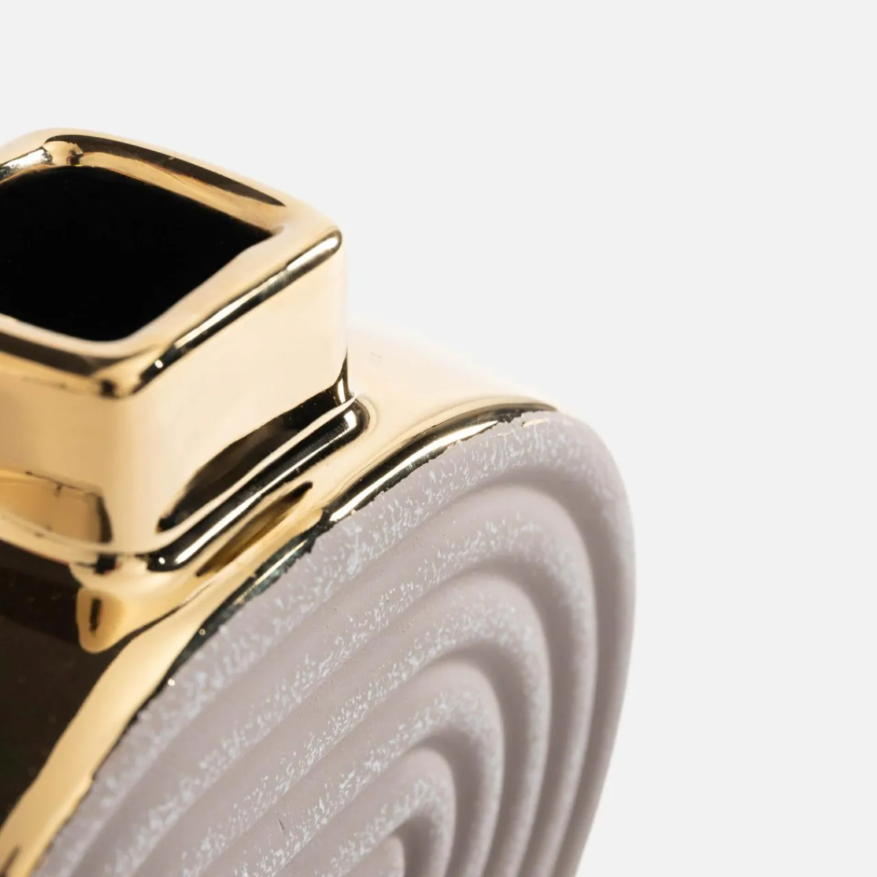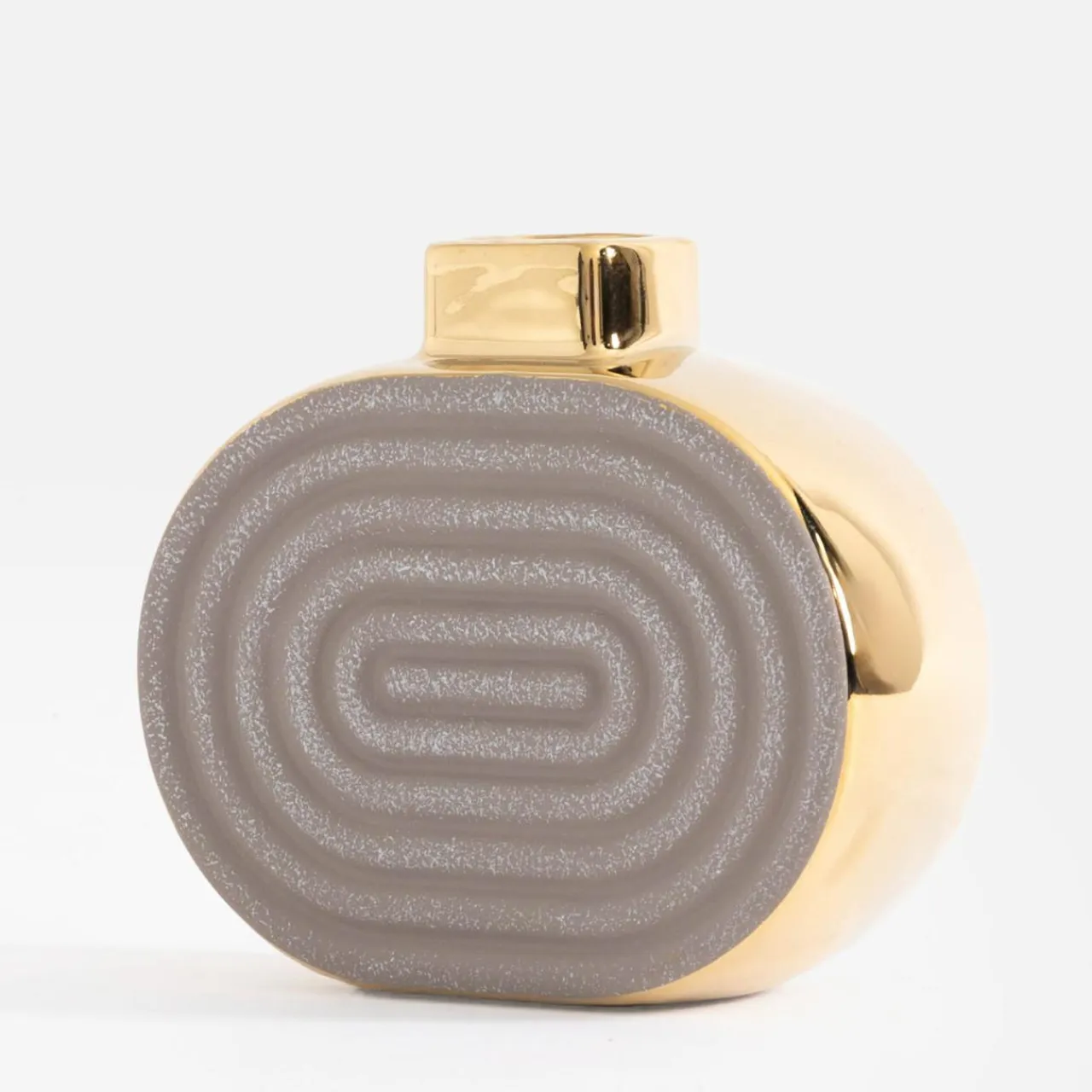 Elegancki i stylowy szaro-złoty wazon o wysokości 15 cm doskonale wpisuje się w estetykę glamour. Wykonany z ceramiki, łączy w sobie nowoczesny design z luksusowym wykończeniem. Połyskujące złote akcenty w połączeniu z subtelną szarością tworzą wyrafinowany kontrast, który idealnie uzupełni każdą aranżację wnętrza. Kompaktowy rozmiar wazonu sprawia, że świetnie nadaje się do wyeksponowania pojedynczych kwiatów lub jako dekoracyjny element na półce, stole czy komodzie. Jest to doskonały wybór dla osób ceniących sobie elegancję oraz unikalne dodatki.