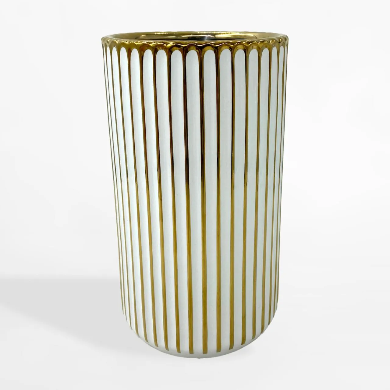 Wazon uświetni każdy stół czy komodę – będzie ozdobą samą w sobie lub uzupełnieniem bukietu kwiatów. Kolory bieli i złota rozjaśnią aranżację. Dekoracyjne żłobienia nadają mu nowoczesnego charakteru, dzięki czemu świetnie wpisuje się w styl glamour czy nowoczesny.