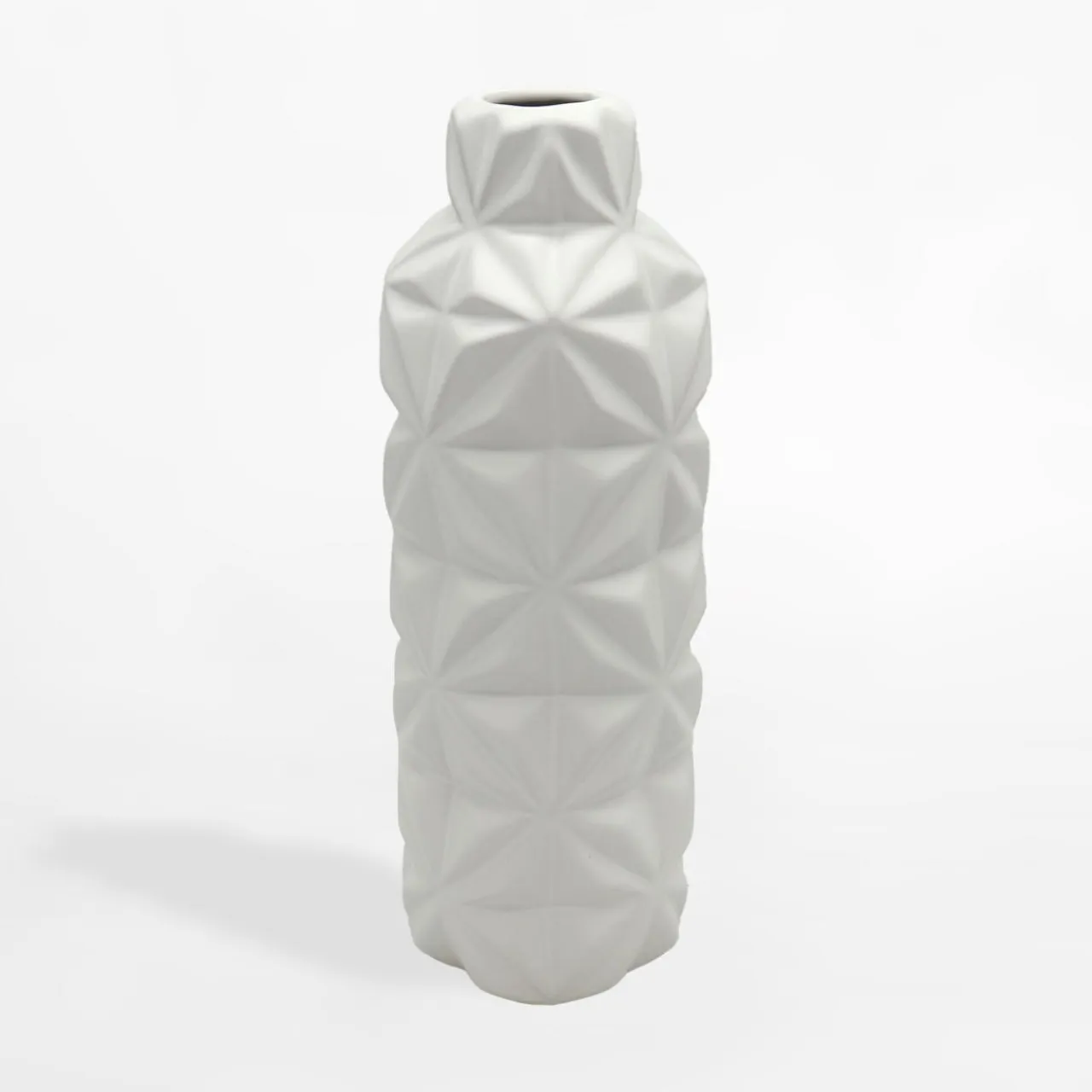 Wazon z delikatnym wzorem świetnie pasuje do nowoczesnych, minimalistycznych i skandynawskich wnętrz. Jego prosty, geometryczny kształt z ozdobnymi detalami przyciąga uwagę. Neutralna biel pięknie komponuje się z kwiatami.