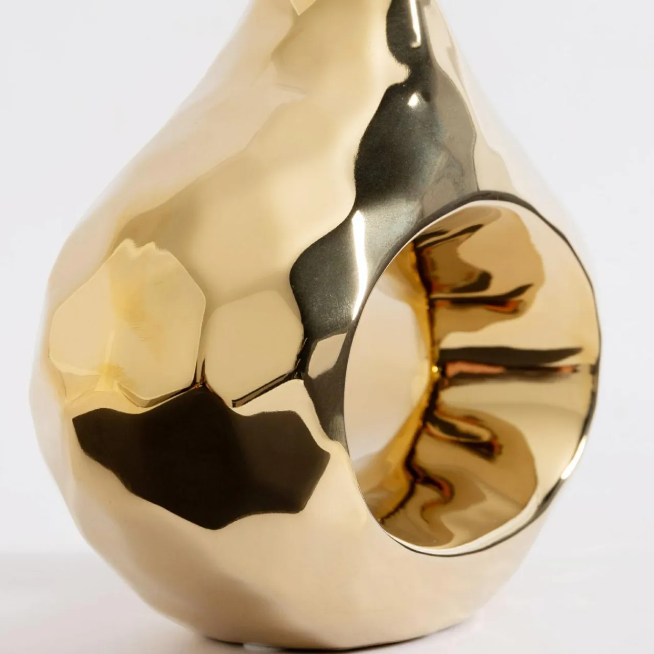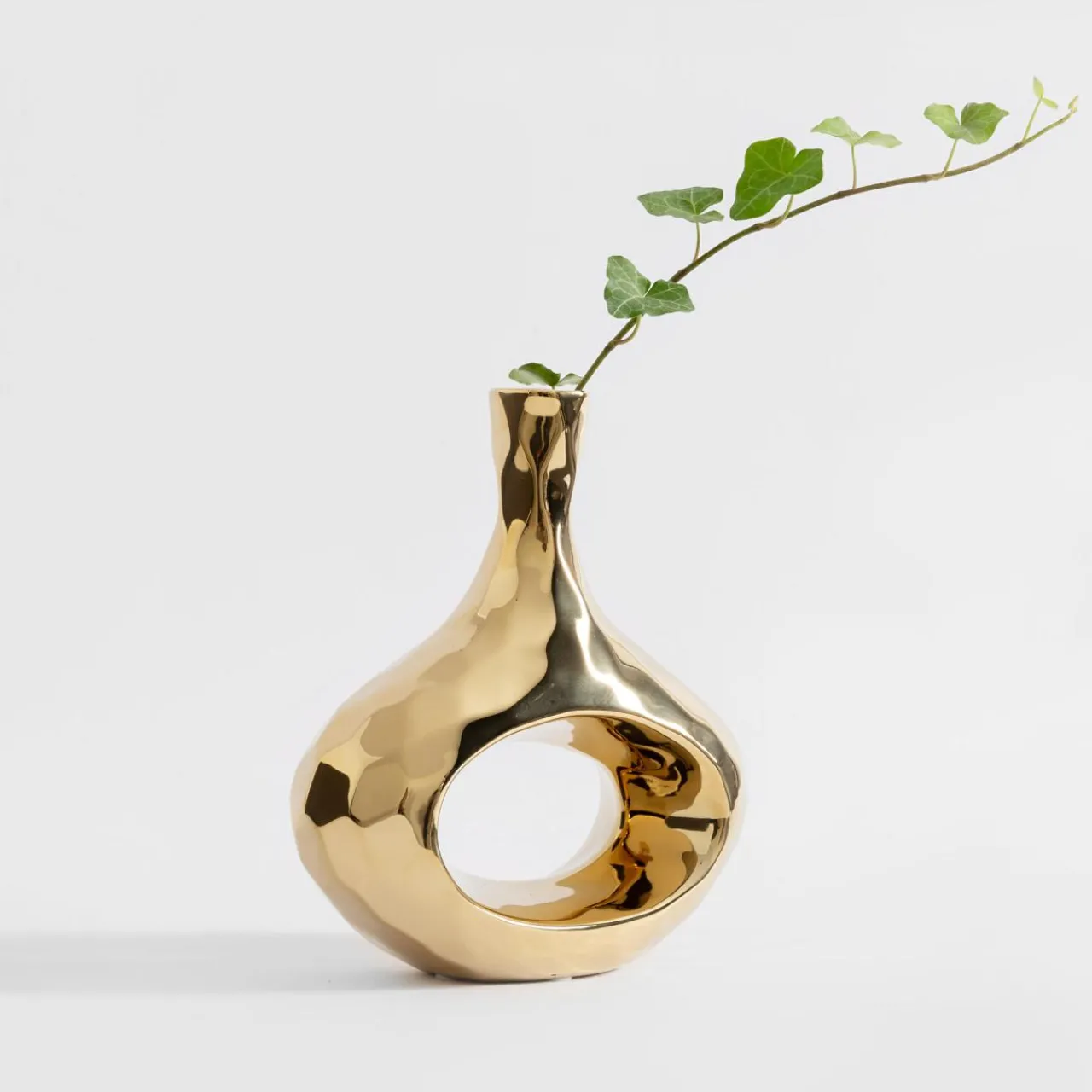 Wazon z dziurą pokochają wszyscy miłośnicy nowoczesnego designu. Wysoki na 20 cm o złotym wykończeniu odnajdzie się w aranżacjach typu glamour i nowoczesnych. Ustawiony na stole w jadalni lub komodzie w salonie stanie się centralnym punktem aranżacji.