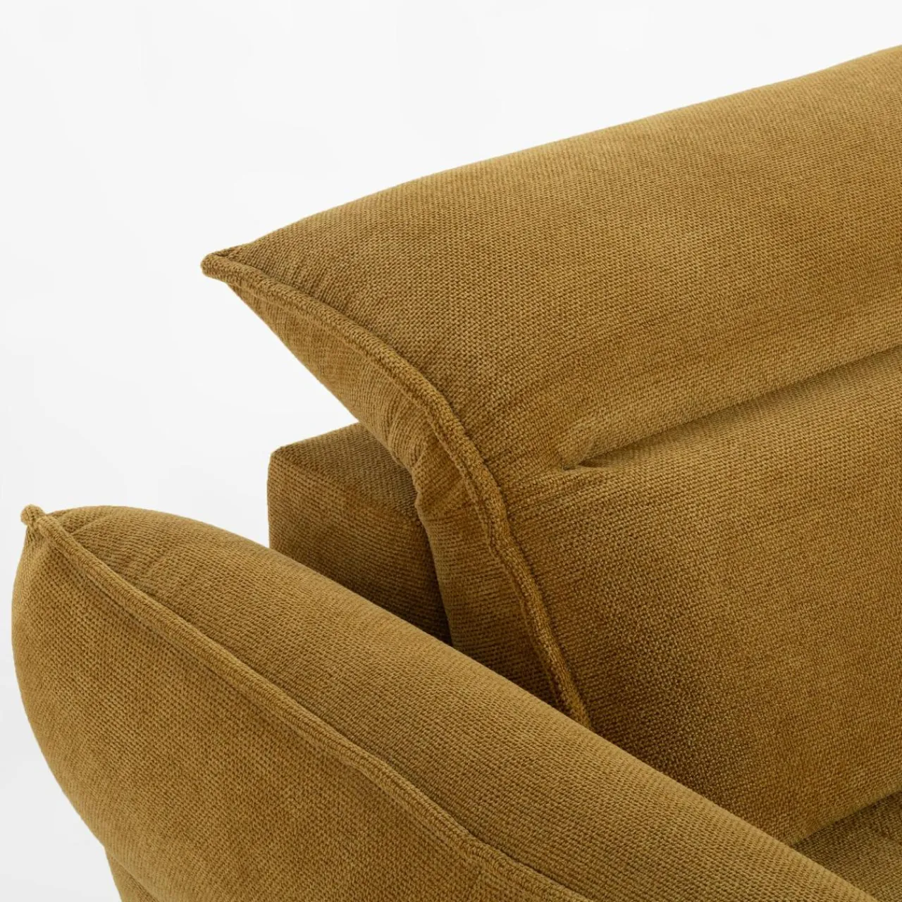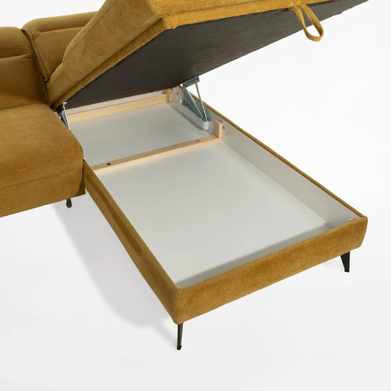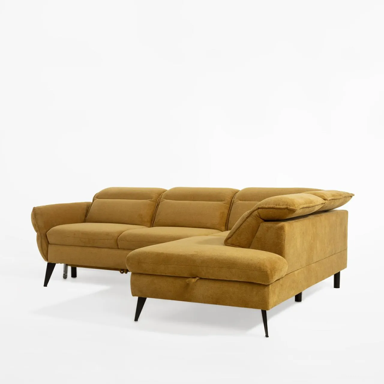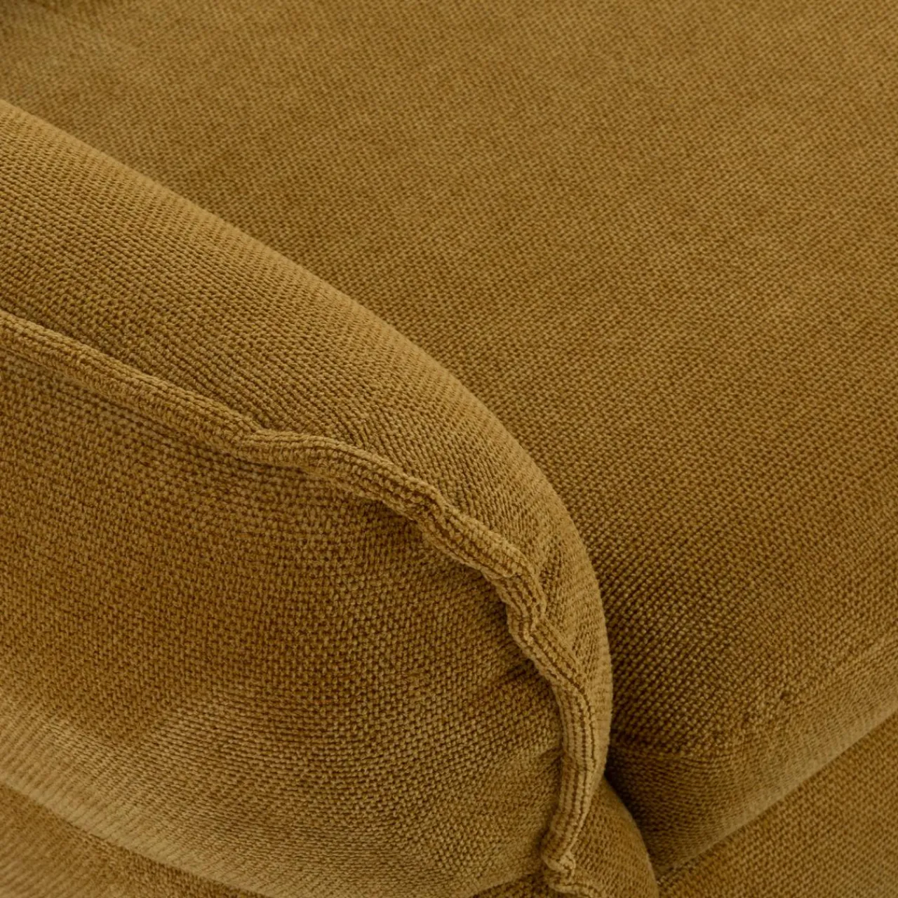 Miękka linia mebla kojarzy się z wygodą podczas wypoczynku, a musztardowy kolor tkaniny wprowadzi nieco ciepła do wnętrza domu. Całości obrazu dopełniają ukośne nóżki w czarnym kolorze.