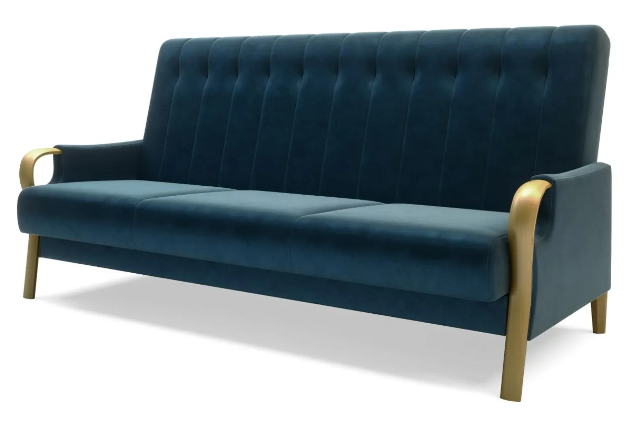 Granatowa, miękka tapicerka i drewniane wykończenie idealnie wpasują się w estetykę retro.