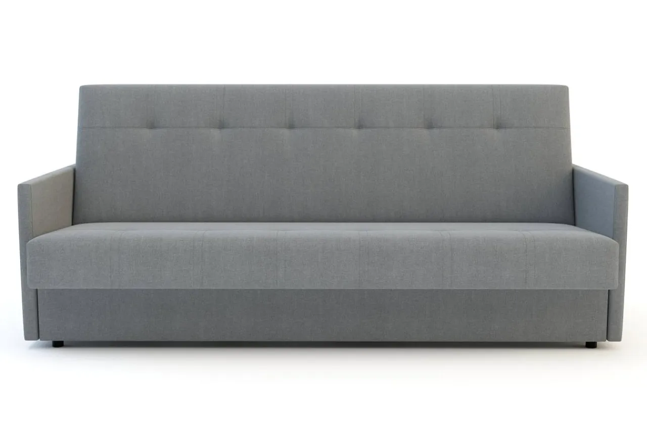 Ma wąskie podłokietniki i ozdobne wciągi na oparciu i siedzisku – dzięki temu wygląda jak tradycyjna sofa.