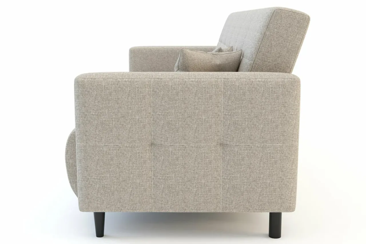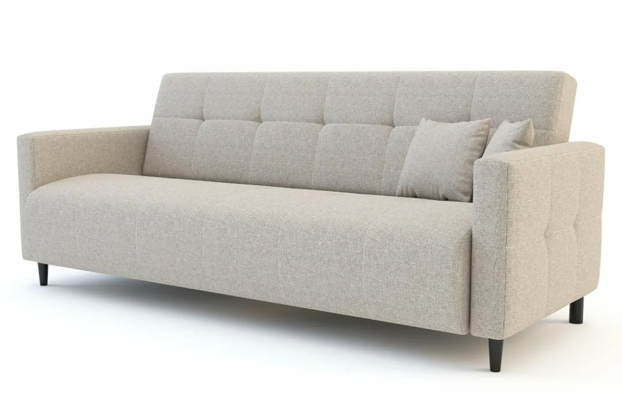 Połączenie pianki i sprężyn falistych w siedzisku i oparciu sprawia, że po rozłożeniu powierzchnia spania wersalki dobrze dopasowuje się do kształtu ciała. Ciekawym elementem jest ozdobne pikowanie, które ładnie przełamuje pozorna prostotę siedziska i oparcia. Tapicerowane podłokietniki subtelnie uzupełniają linie mebla i pozwalają przybrać wygodna pozycję.