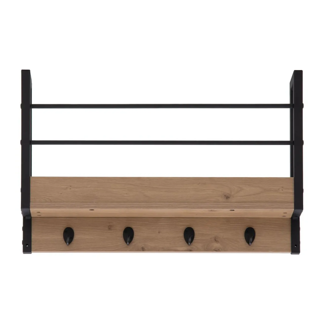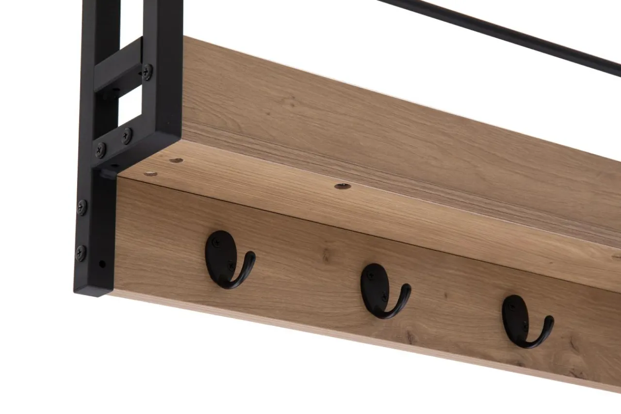 Korpus wieszaka wykończony jest okleiną drewnopodobną. Rysunek słojów i sęków przypomina naturalne drewno dębowe.