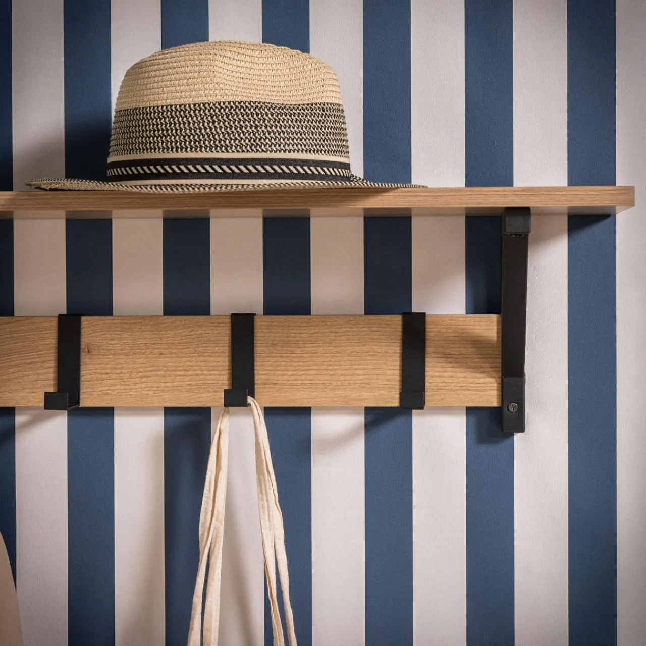 Korpus wieszaka wykończony jest okleiną drewnopodobną. Rysunek słojów i sęków przypomina naturalne drewno dębowe.