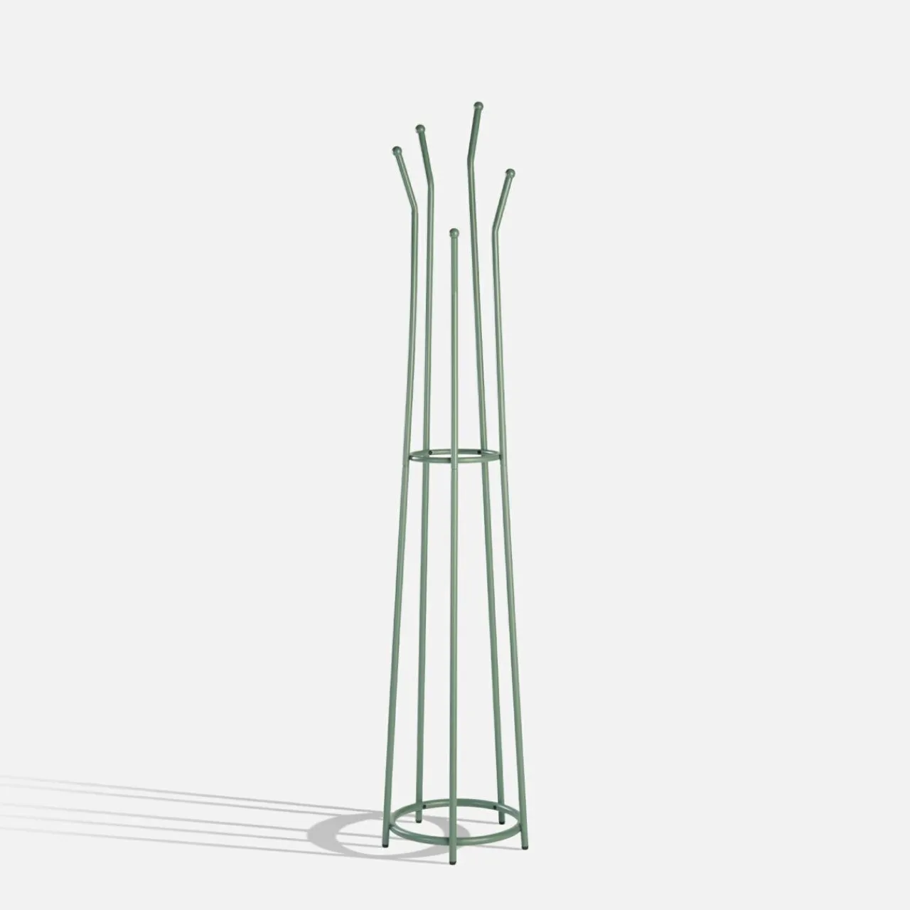 Smukła forma wieszaka sprawia, że odnajdzie się on w wąskich korytarzach czy przedpokojach. Na haczykach odwiesisz kurtki, płaszcze, parasole i kapelusze. Wieszak wykonany z zielonych, metalowych rurek podkreśli nowoczesne wnętrza, ale też te vintage, retro czy urban jungle.