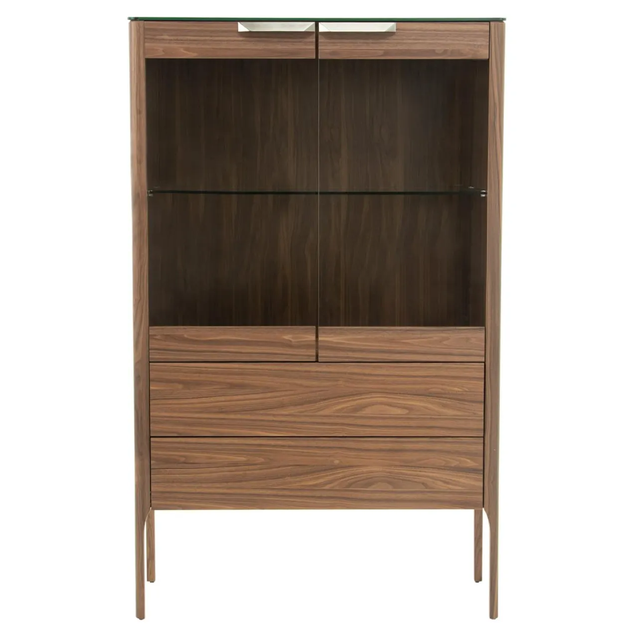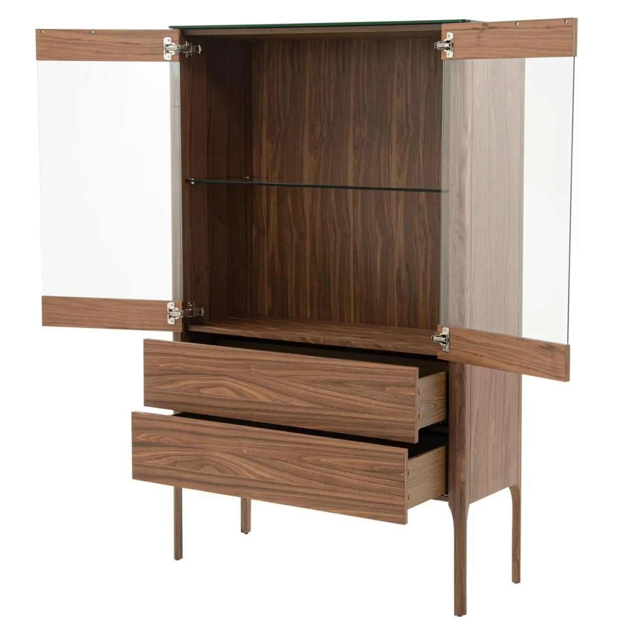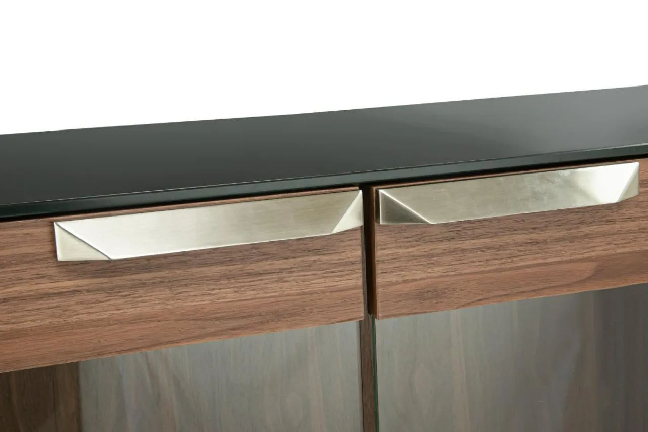 Witryna CHARTUM została pokryta fornirem orzechowym i zabezpieczona lakierem. Jego ciemna barwa sprawia, że mebel pasuje do nowoczesnych i eleganckich przestrzeni.