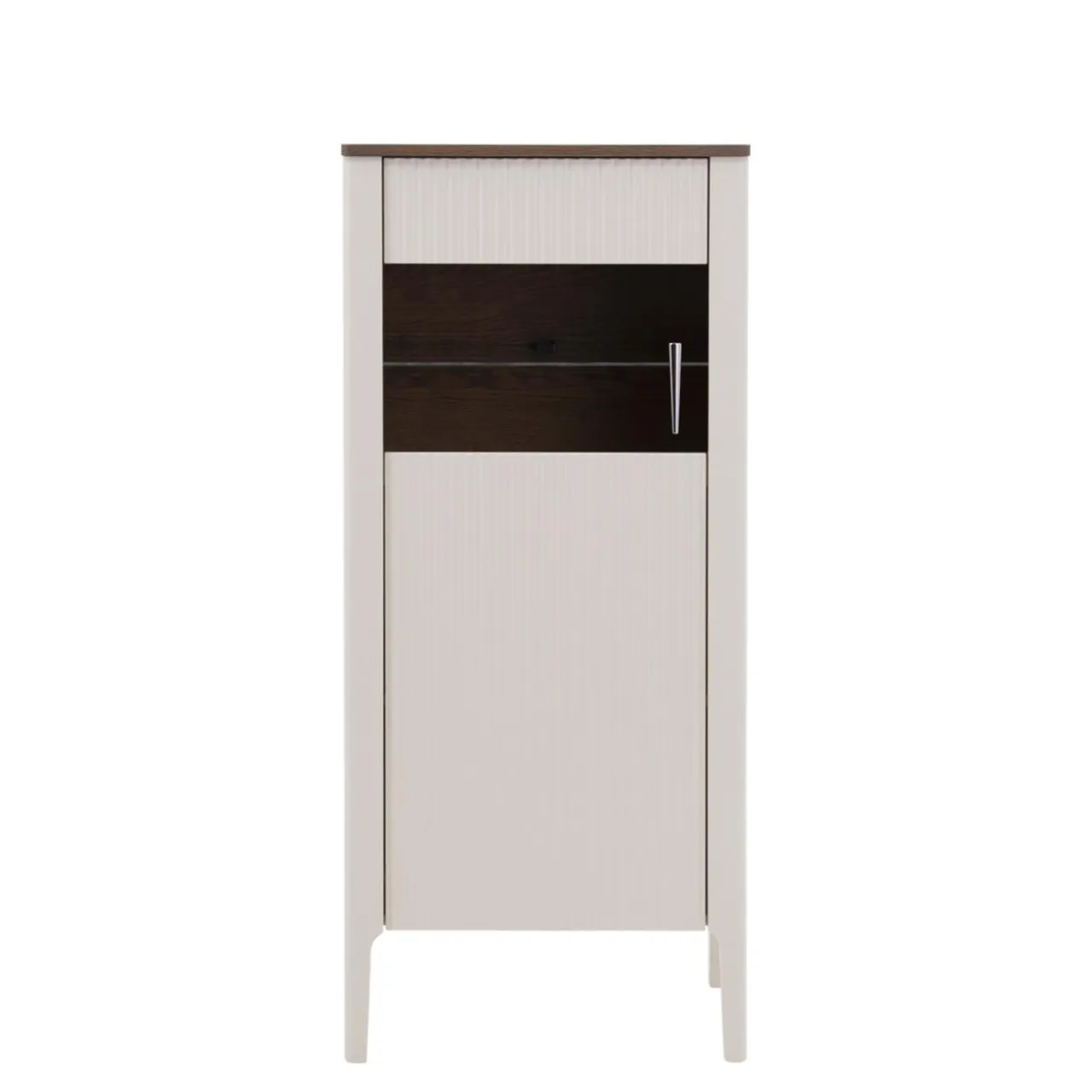 - W górnej części frontu zastosowano szkło antisol, natomiast całość wykonana jest w płyty MDF pokrytej matowym lakierem.