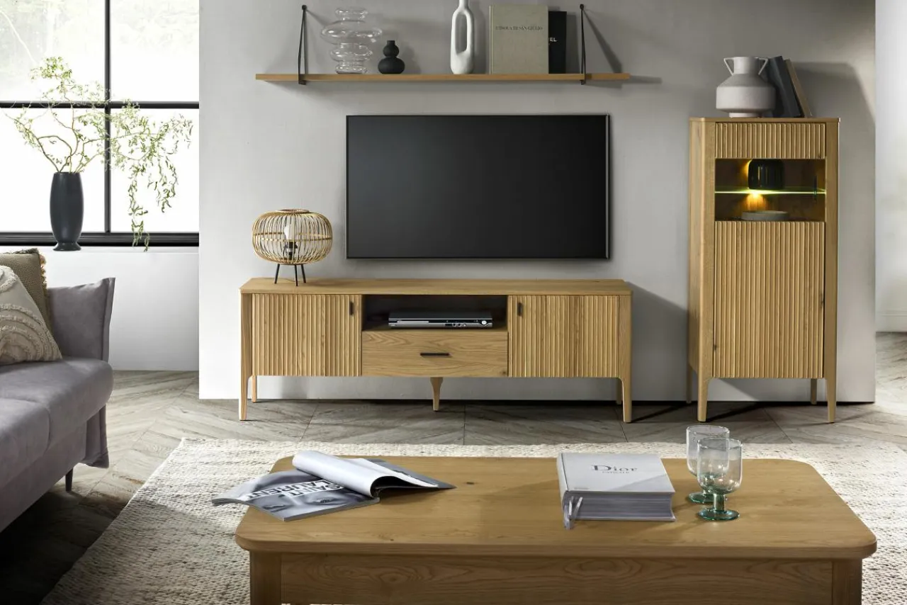 Nowoczesna witryna NAVARRA stanowi praktyczne uzupełnienie aranżacji salonu lub jadalni.