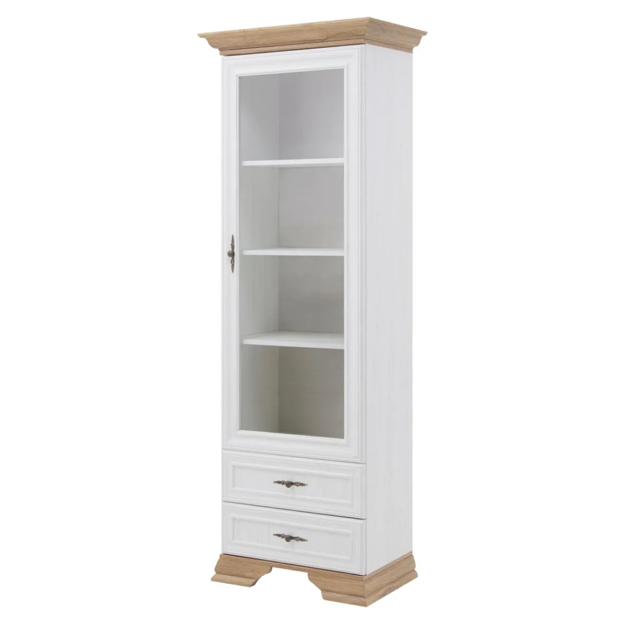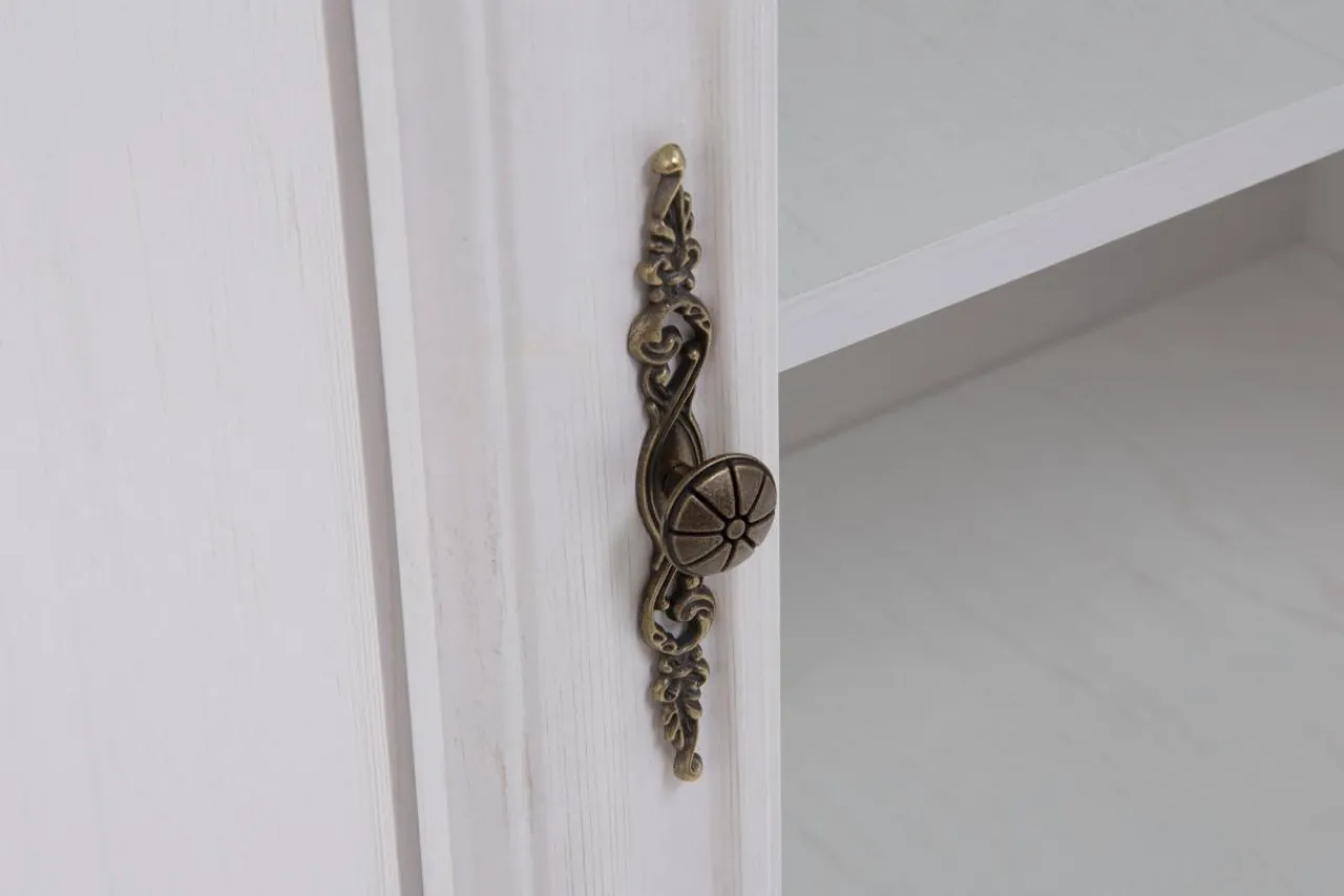 - Witrynę wykonano z płyty wiórowej w kolorze bielonej sosny andersen. Widoczny rysunek imitujący naturalne usłojenie drewna i przetarcia sprawiają, że komoda przypomina postarzany mebel.