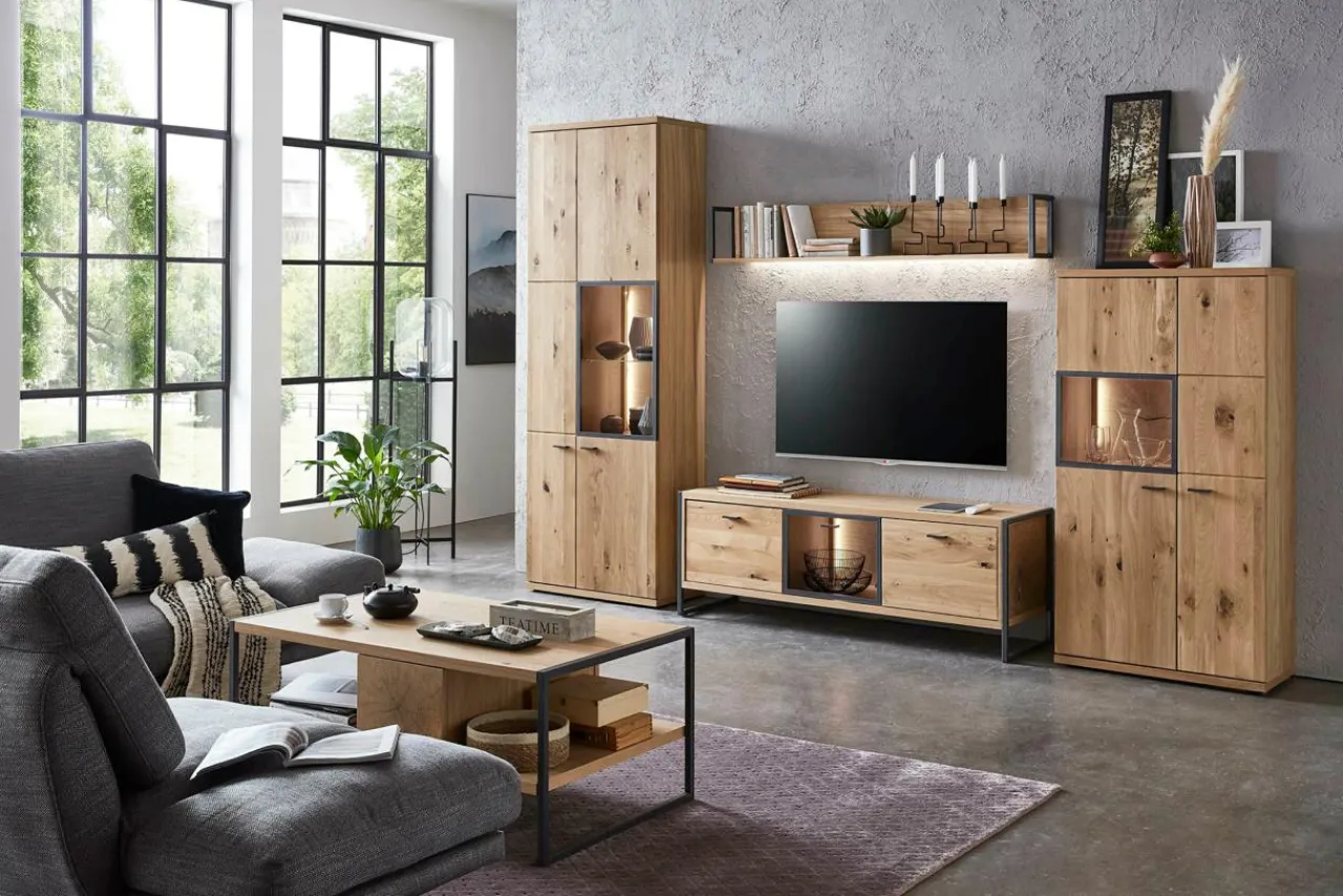 Witrynę FLORA docenisz za naturalny design – fronty z litego drewna oraz pień na tylnej ściance podkreślają unikatowy wygląd mebla.