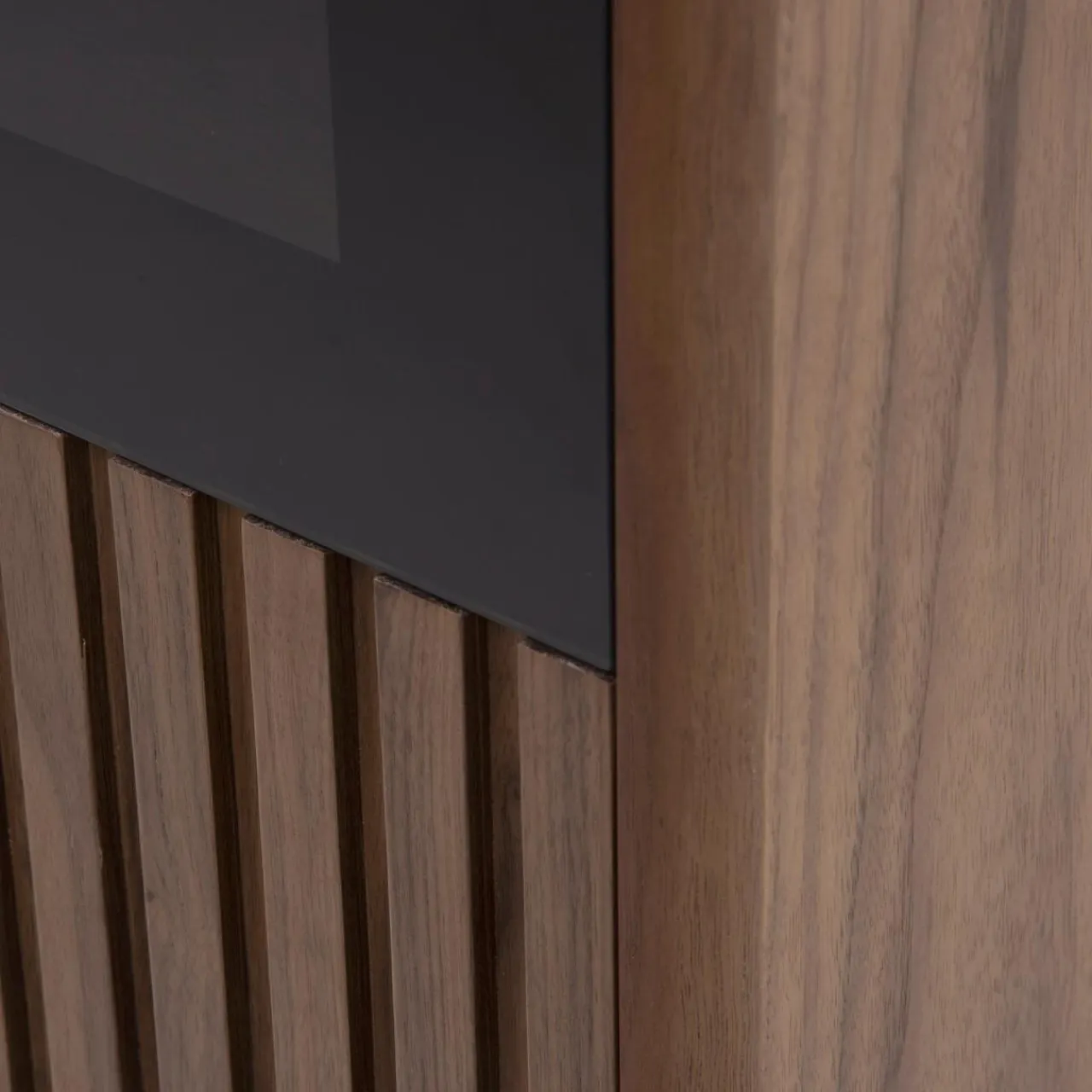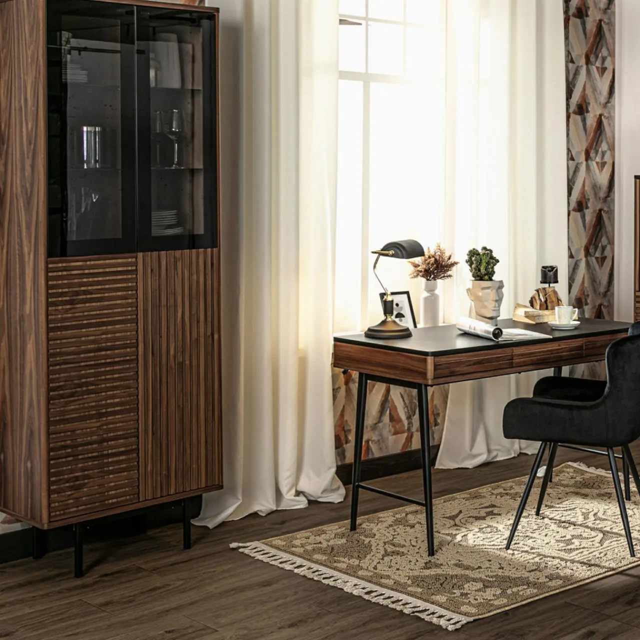 - Połączenie wybarwienia orzechowego drewna z czarnymi nogami wprowadza do wnętrza industrialny klimat.