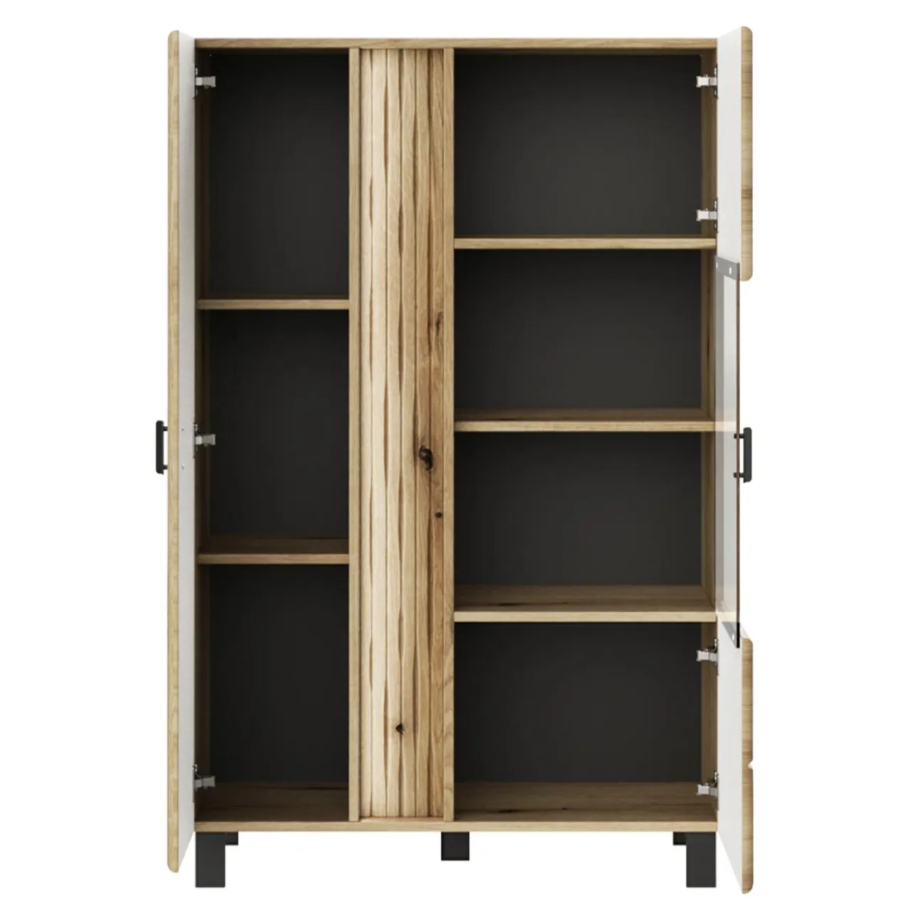 - Metalowe, czarne uchwyty oraz frezowania na froncie stanowią delikatną ozdobę mebli.