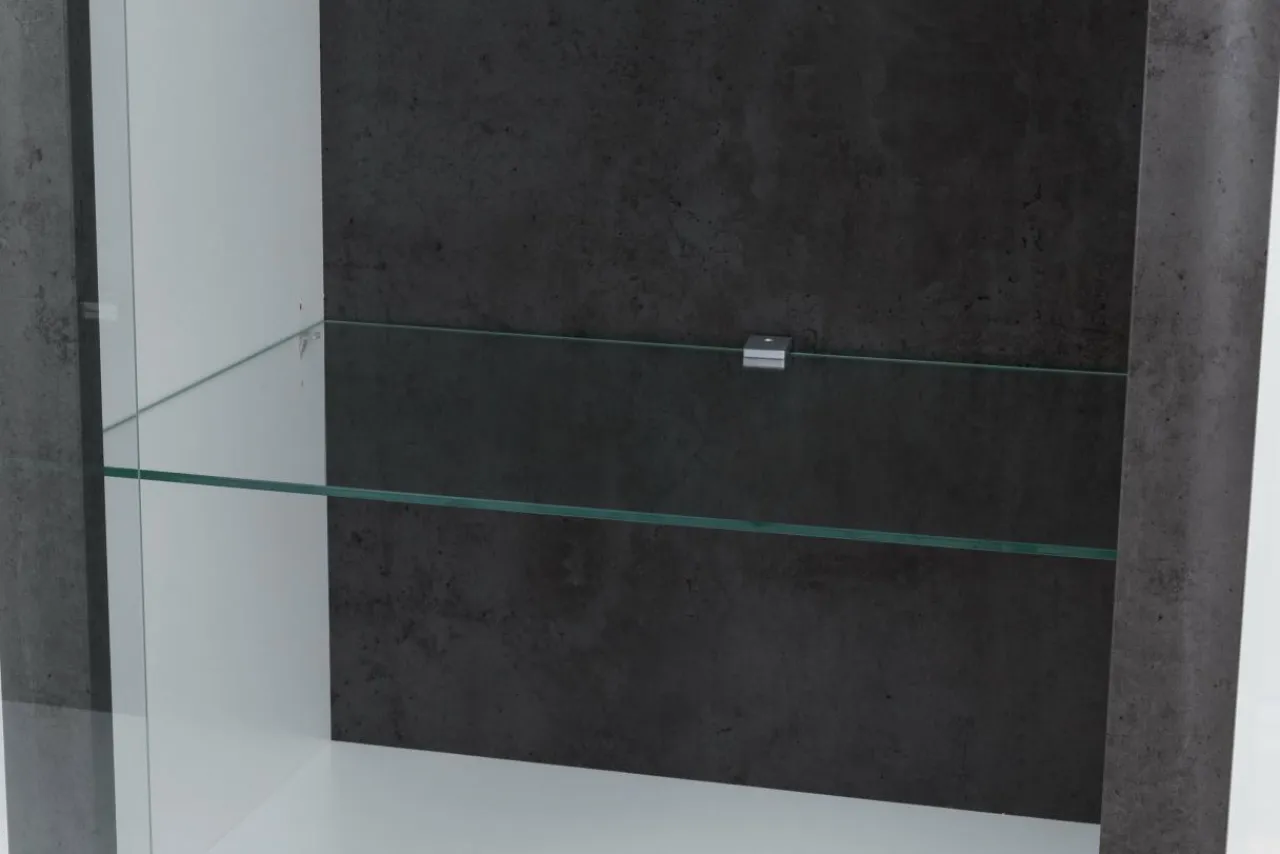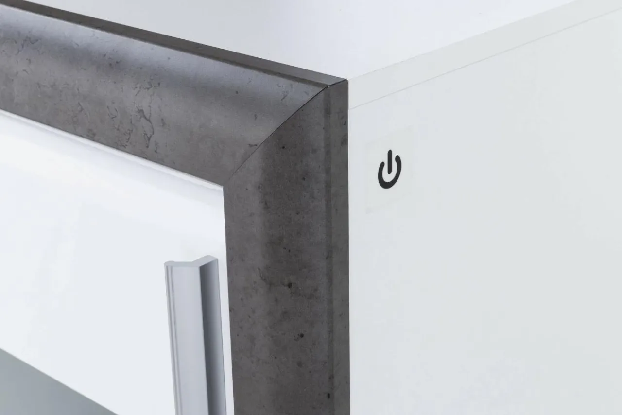 Zawiasy w drzwiach wyposażone w hamulce sprawiają, że drzwi nie hałasują podczas zamykania. Bogactwo wyposażenia wieńczy oświetlenie LED w postaci dwóch listew montowanych pod wieńcem i cokołem oraz dodatkowe oświetlenie na półki szklane. Sterowanie oświetleniem odbywa się za pomocą systemu dotykowego umieszczanego na korpusie meble. Rozwiązanie to ukrywa okablowanie i włączniki. Wystarczy jeden dotyk.