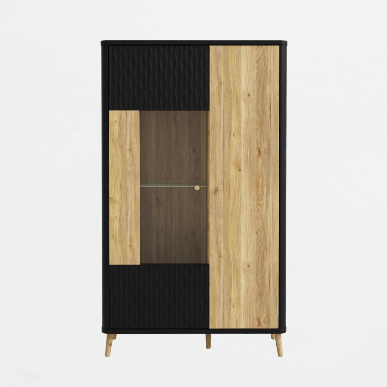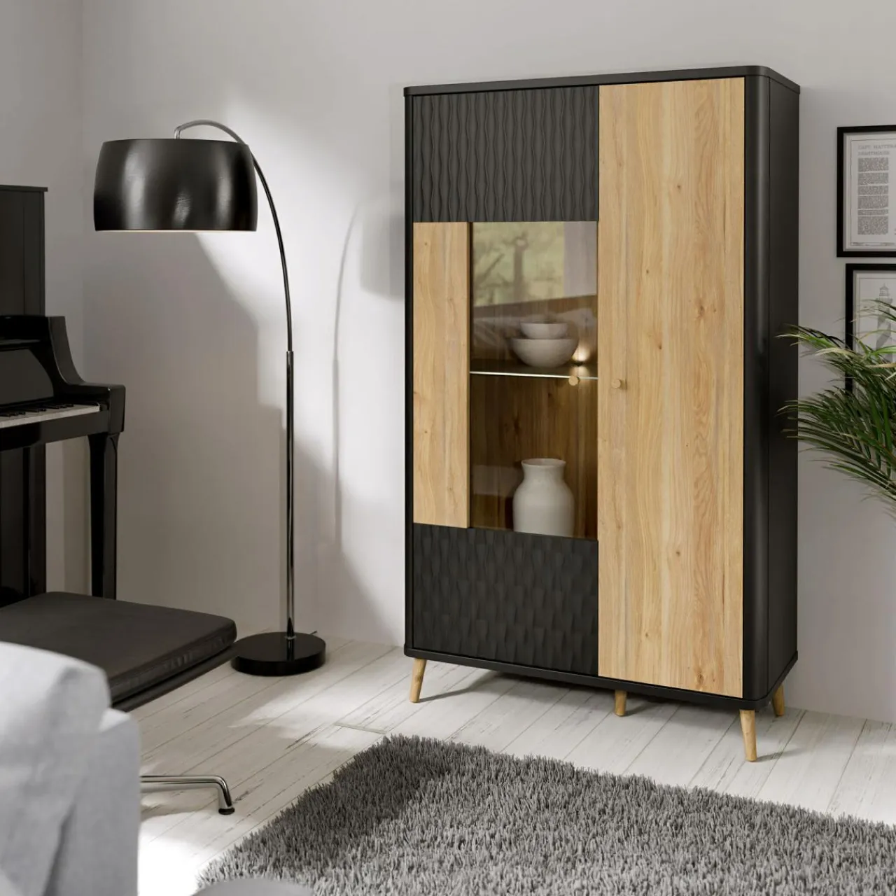 - Nietuzinkowe wzornictwo czarnych frontów tworzy kontrast dla rysunku drewna w odcieniu mauvella oak.