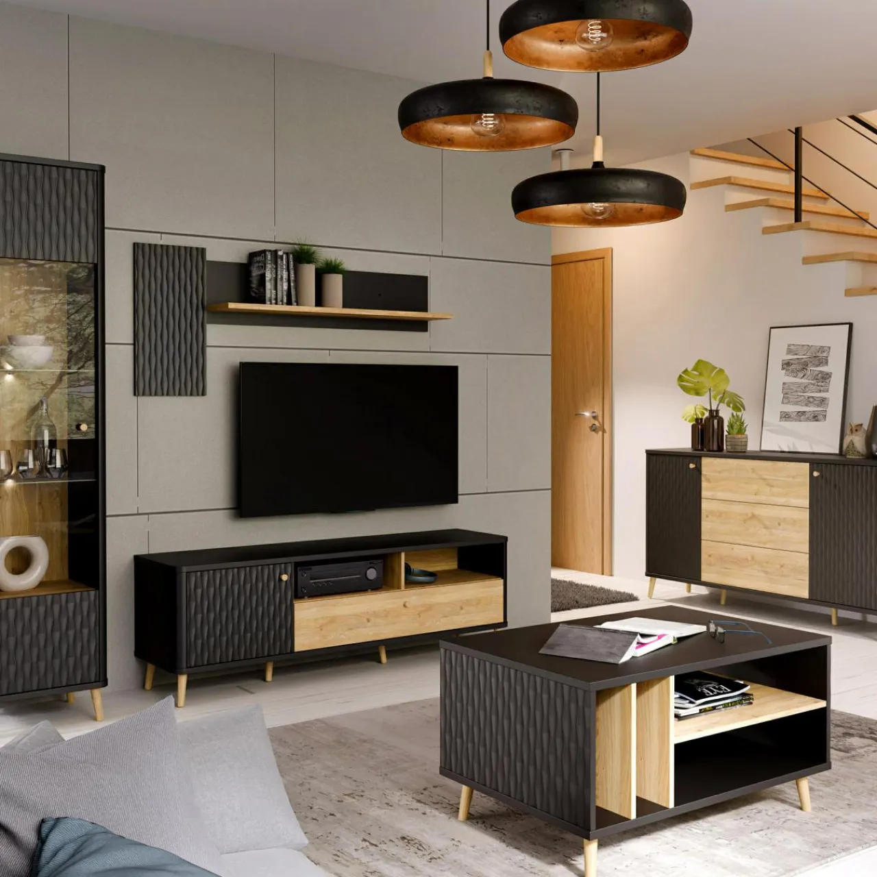 - Nietuzinkowe wzornictwo czarnych frontów tworzy kontrast dla rysunku drewna w odcieniu mauvella oak.