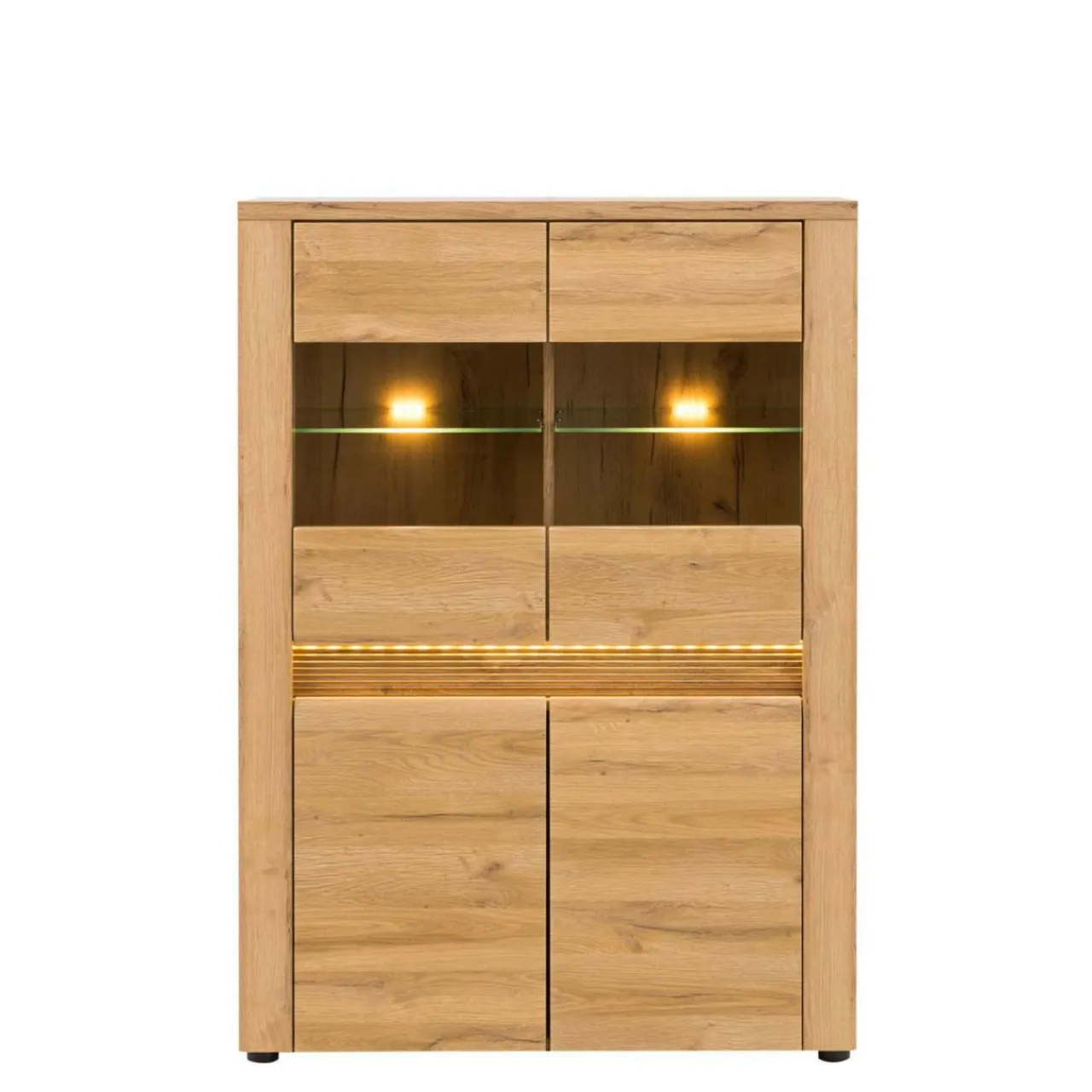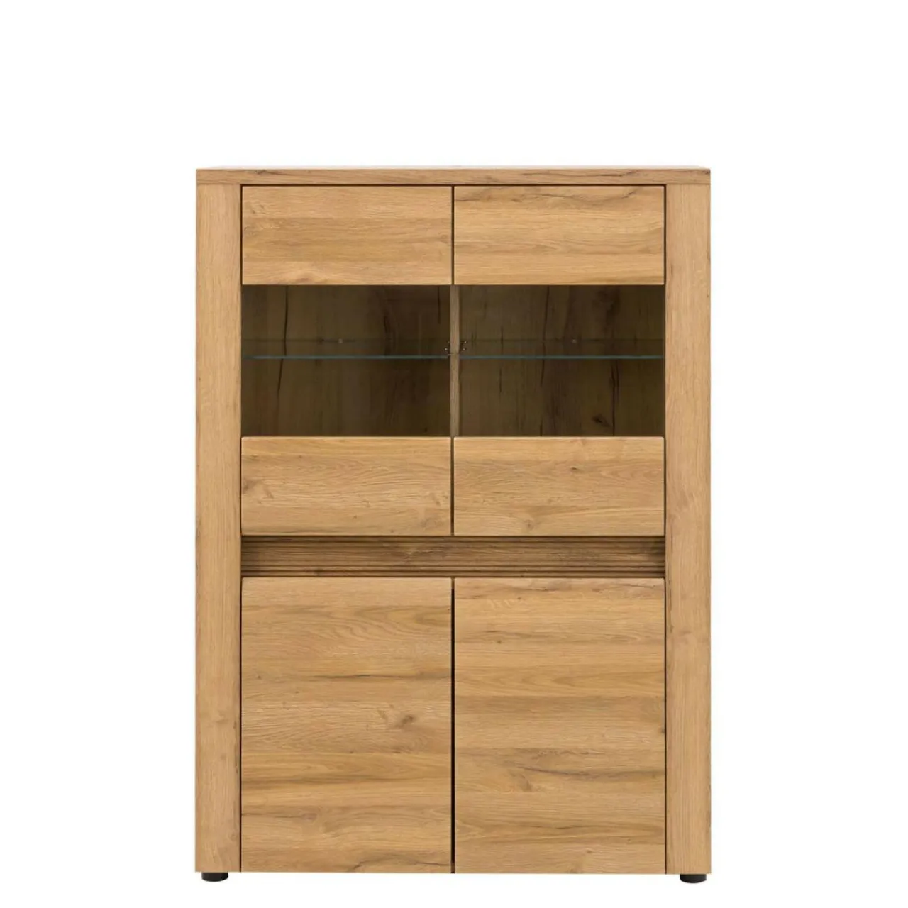 Wnętrze kredensu kryje praktyczne wnęki ukryte za pełnymi drzwiami oraz podświetlaną półkę za szklanymi drzwiami, idealną do wyeksponowania porcelany lub innych dodatków. Oświetlenie jest także zamontowane pomiędzy górnymi a dolnymi drzwiczkami.