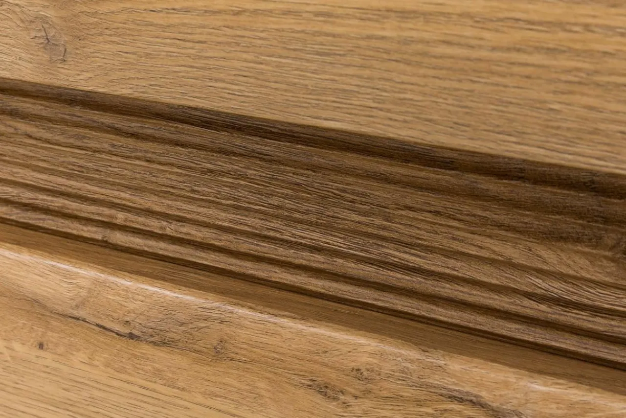 Ciepły odcień dębu dodaje pomieszczeniu przytulności, którą dodatkowo wzmaga jeszcze oświetlenie LED o ciepłej, białej barwie. Brak widocznych uchwytów i delikatne żłobienia na froncie dodają meblom elegancji.