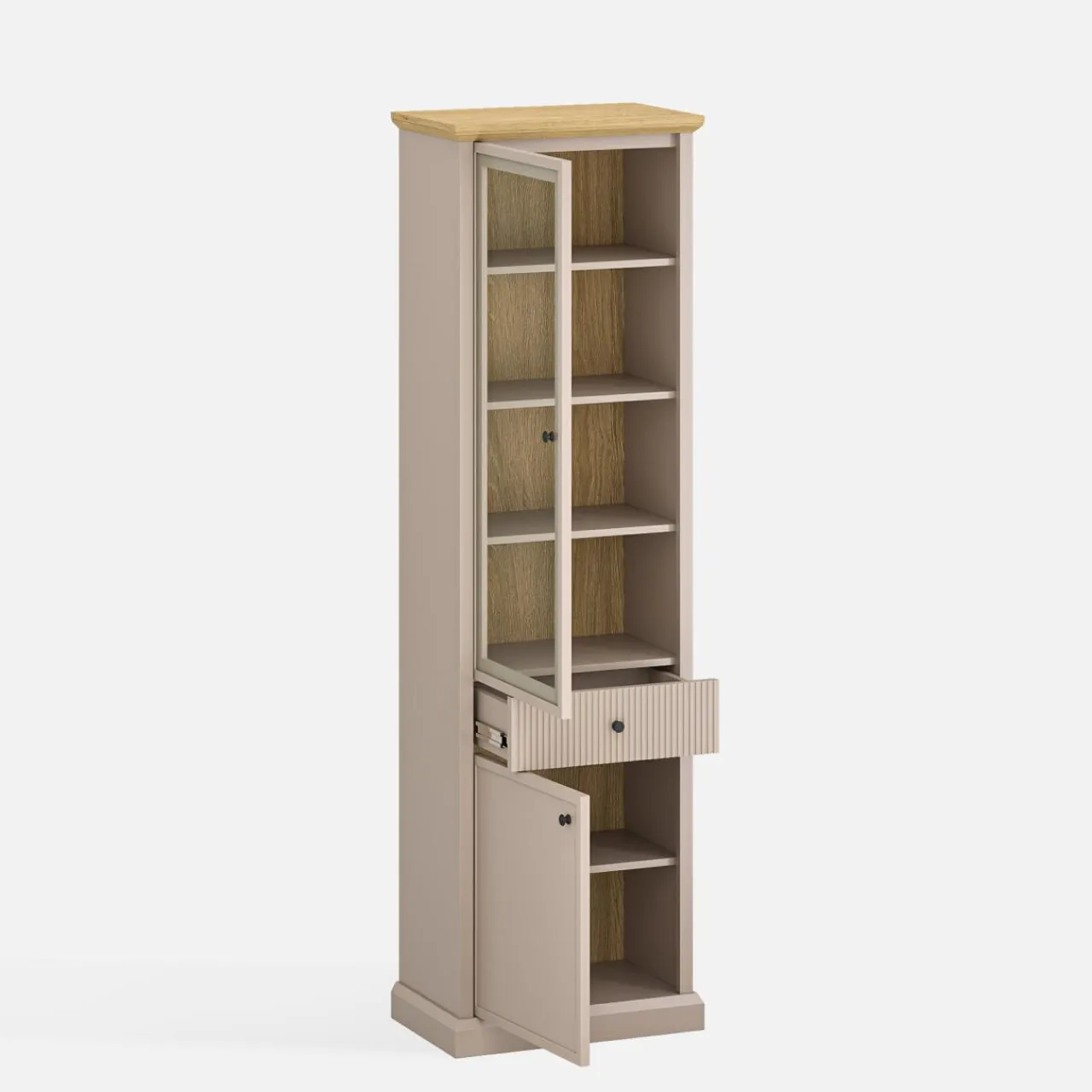 Witryna wysoka IDELLO w odcieniach taupe i dębu kamiennego to idealne miejsce do wyeksponowania porcelanowej zastawy, pamiątek z wakacji lub innych ulubionych przedmiotów.