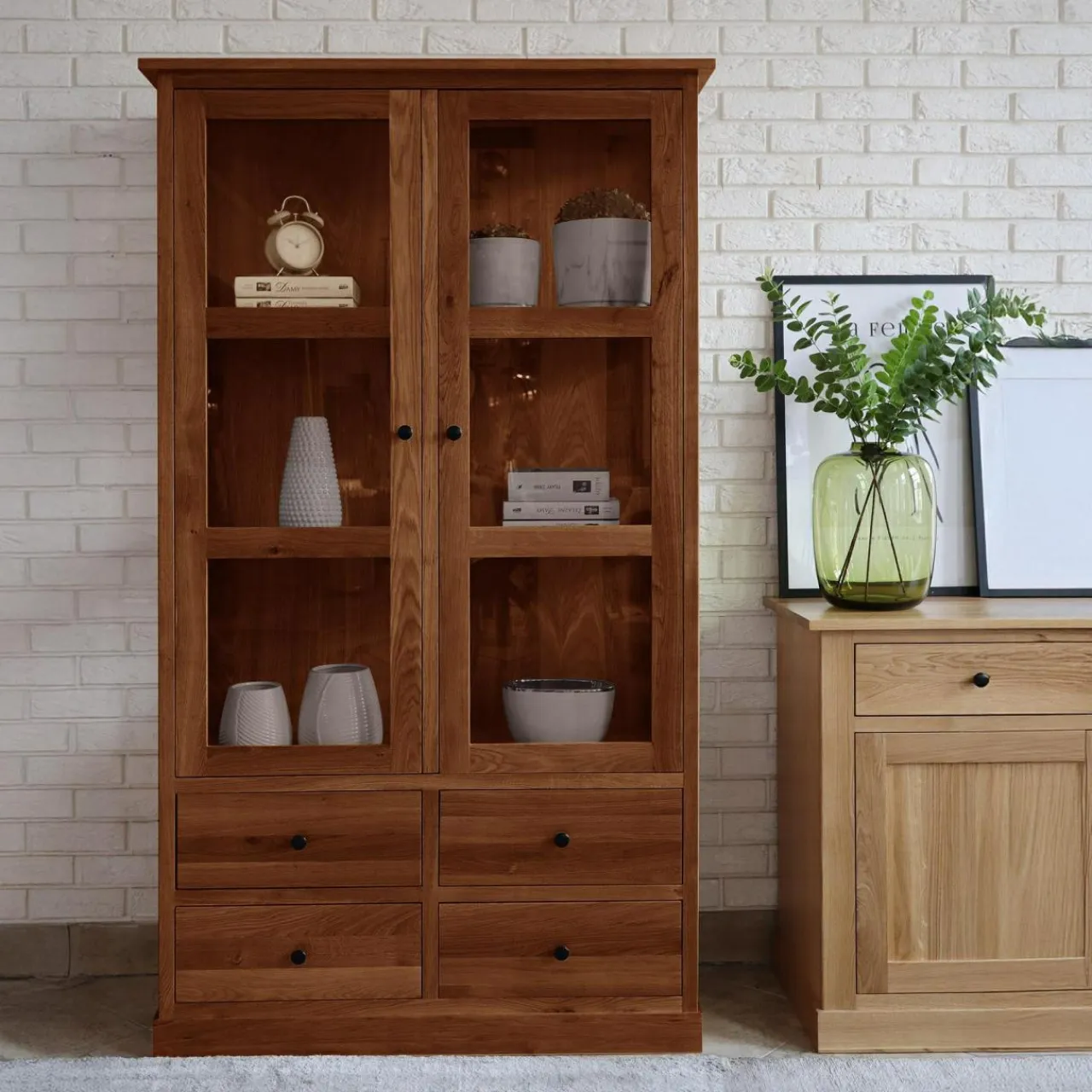 Witryna STELLA to praktyczny mebel, wykonany z litego drewna w odcieniu dąb koniakowy. Dzięki 4 szufladom oraz przeszklonym półkom, łączy wygodę przechowywania z estetyką ekspozycji. Jest idealnym wyborem do salonu, jadalni lub gabinetu.