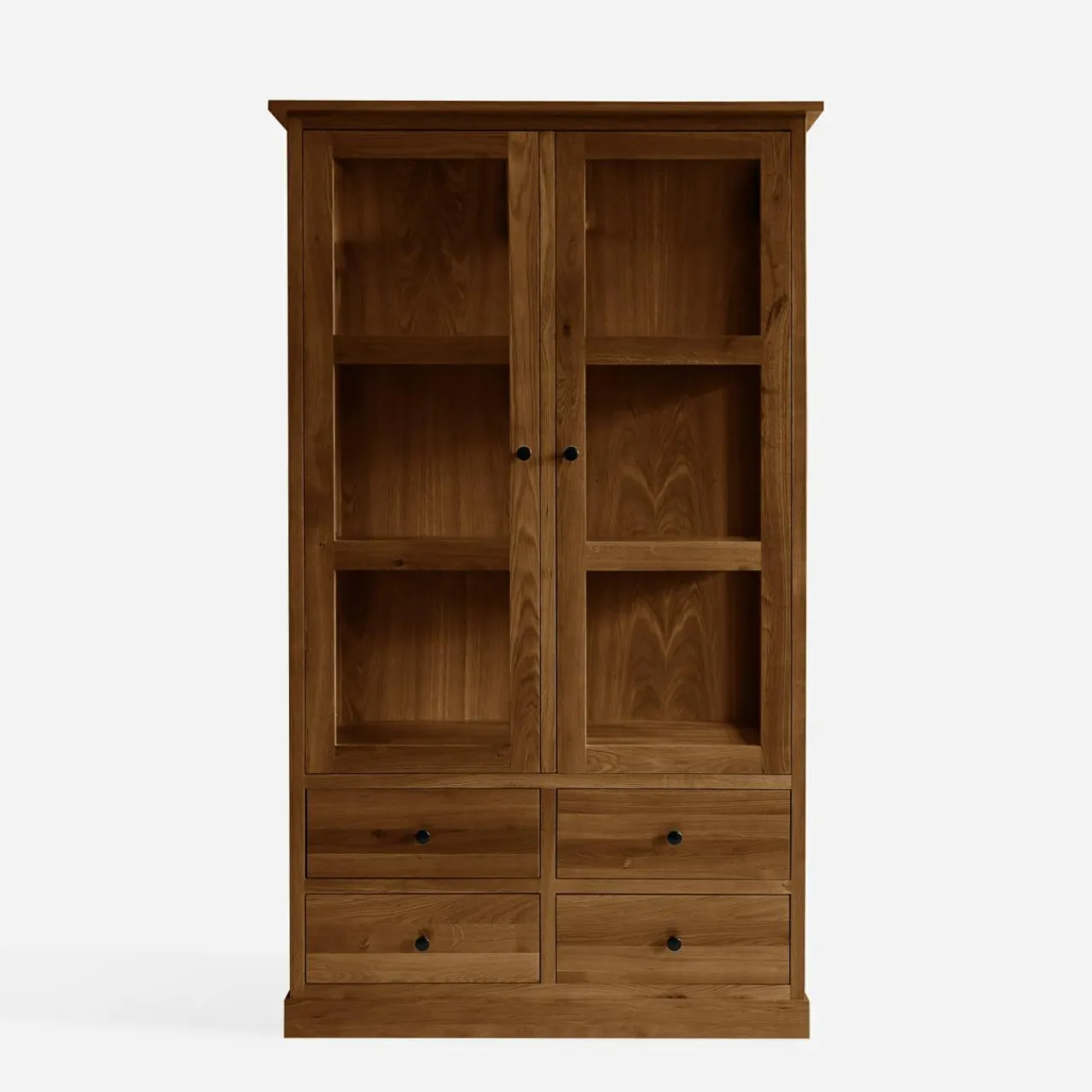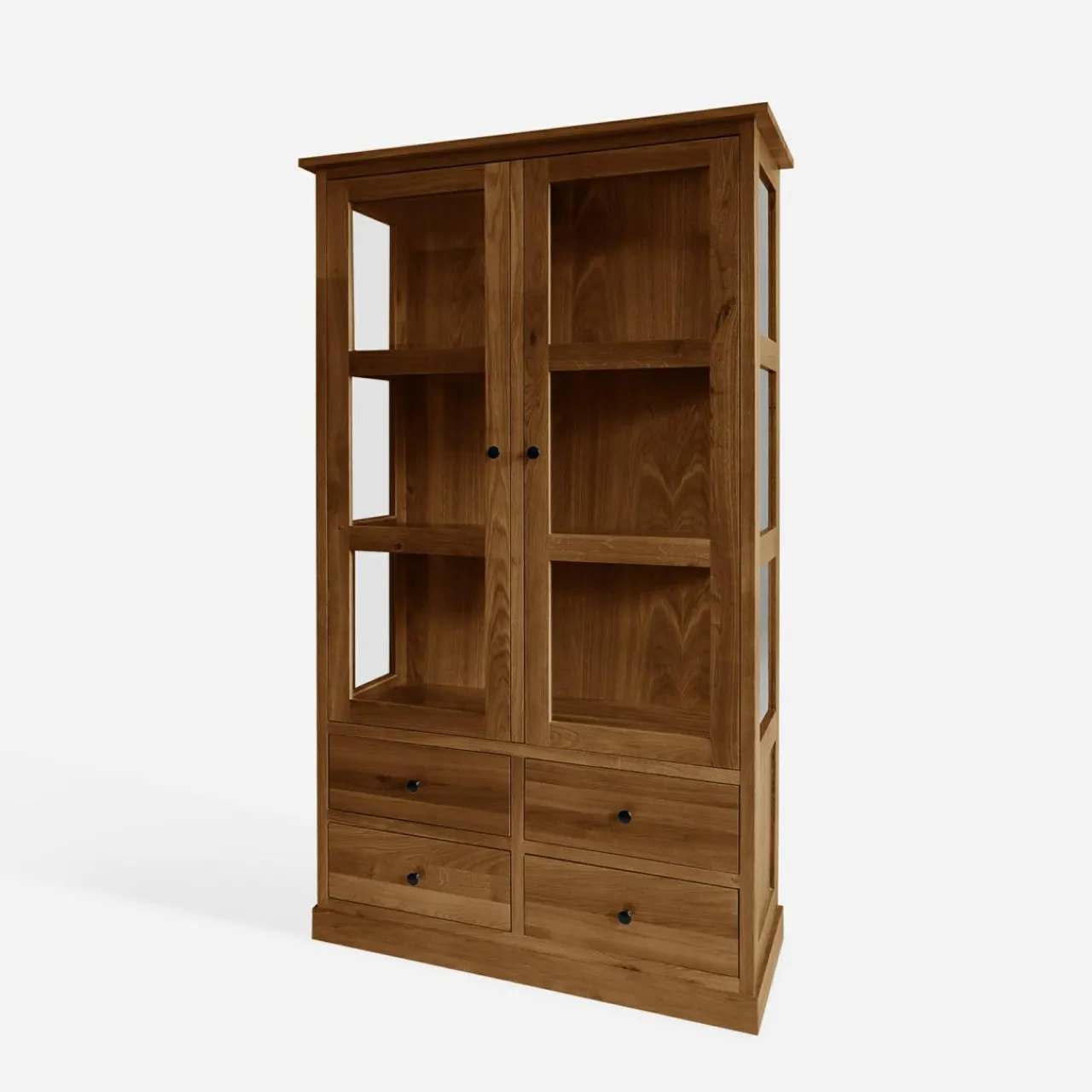 Witryna STELLA to praktyczny mebel, wykonany z litego drewna w odcieniu dąb rustykalny. Dzięki 4 szufladom oraz przeszklonym półkom, łączy wygodę przechowywania z estetyką ekspozycji. Jest idealnym wyborem do salonu, jadalni lub gabinetu.