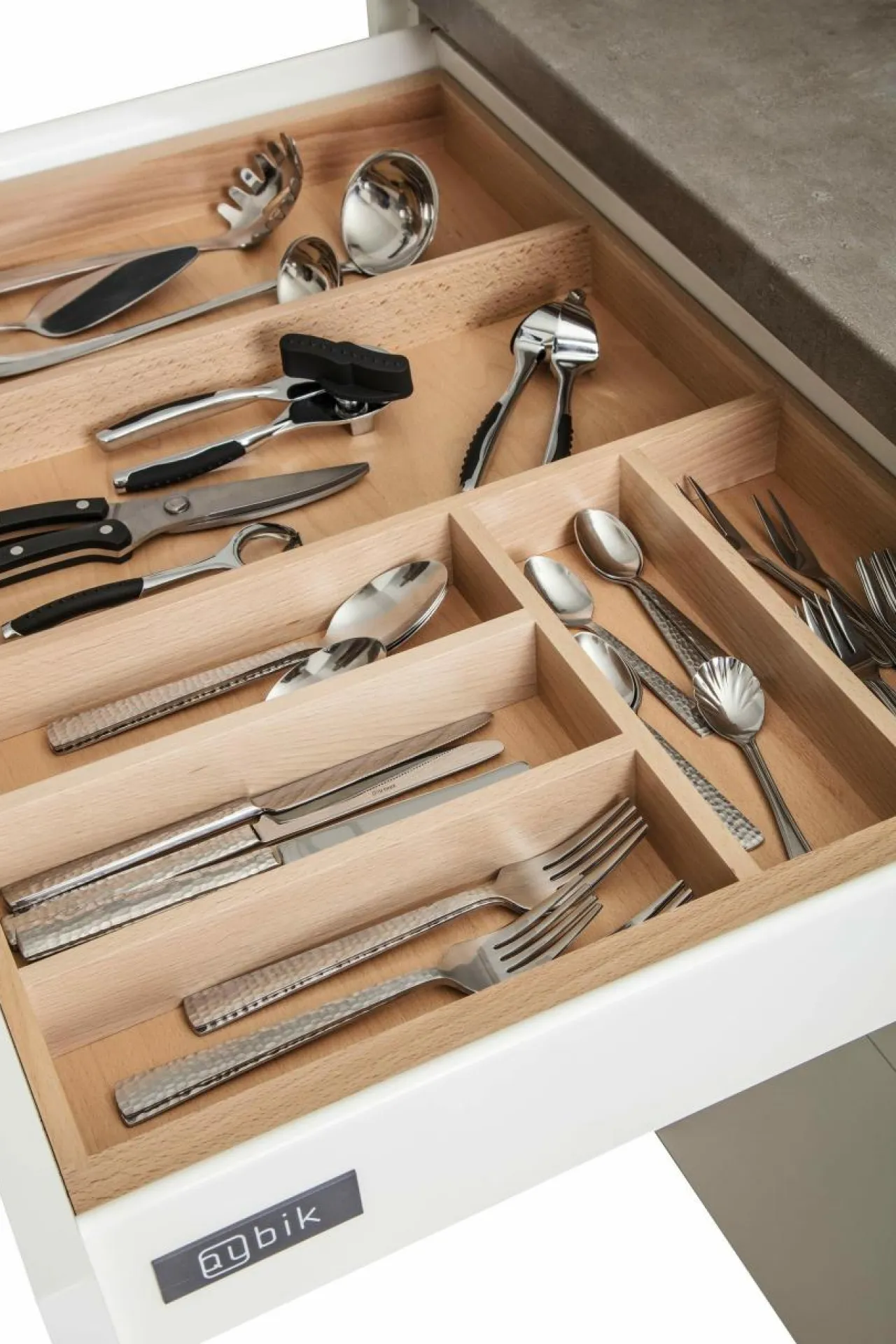 Idealnie komponuje się z linią szuflad, pozwala w przejrzysty sposób zorganizować sztućce. Dzięki dopasowanym przegródkom widelce, noże łyżki i łyżeczki można ładnie ułożyć i przygotować do użycia.